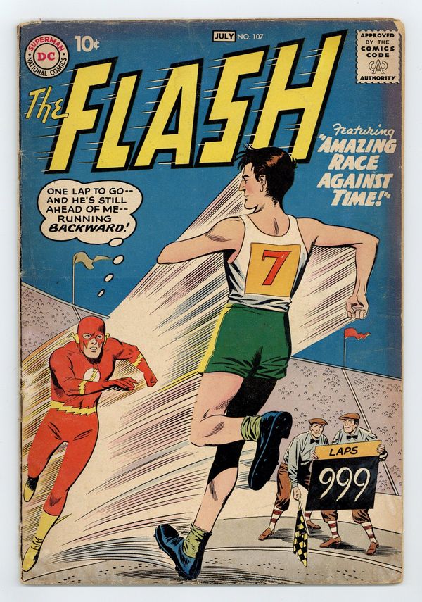 Cover pencils by Carmine Infantino, inks by Joe Giella. Grodd Trilogy part 2 in Return of the Super-Gorilla, script by John Broome, pencils by Carmine Infantino, inks by Joe Giella; Solovar contacts Flash to help him find Gorilla Grodd, who has sought refuge in the underground world of the Bird-People. The Amazing Race Against Time!, script by John Broome, pencils by Carmine Infantino, inks by Joe Giella; while trying to stop a runaway truck, Flash encounters an amnesiac who can run faster than him. House of Secrets and Mystery in Space ad. Flash Facts page. Palisades Amusement Park ad with Superman. Life Among the Gorillas! article. Jet Speedboat Ace! fact page. 36 Pages, Full Color. Cover price $0.10.