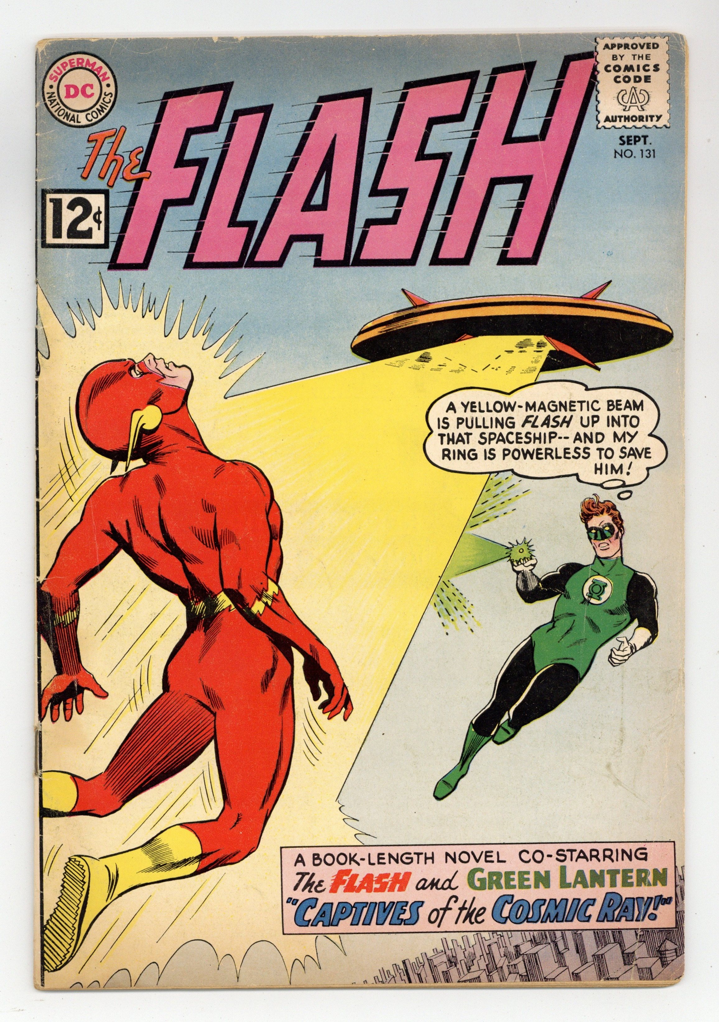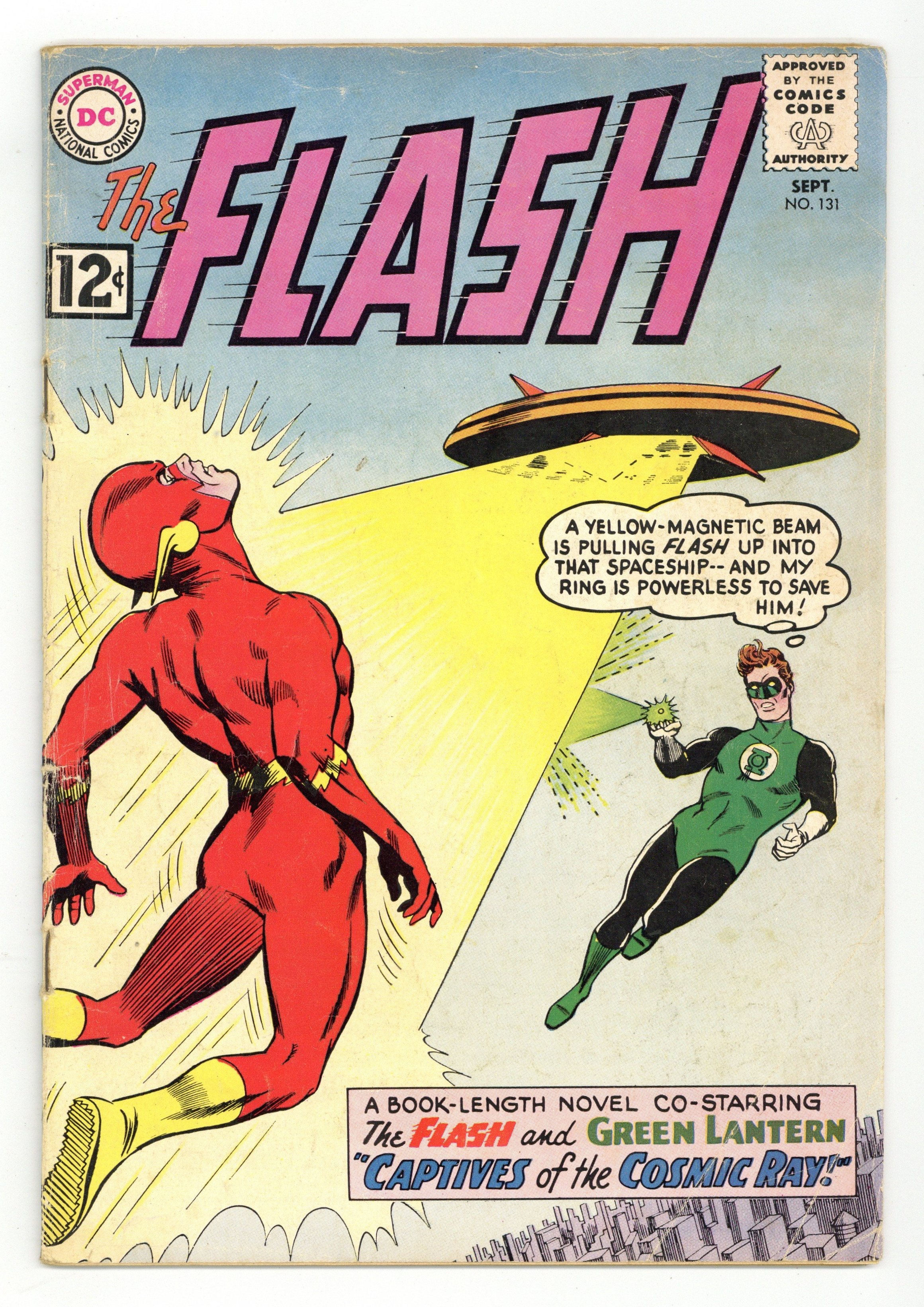 Starts Jan 19 Cover pencils by Carmine Infantino, inks by Joe Giella. Early Green Lantern crossover in Captives of the Cosmic Ray, script by John Broome, pencils by Carmine Infantino, inks by Joe Giella; Barry vacations in Coast City; Flash and Green Lantern go after an alien ship that has been spotted over the city; Flash gets zapped into the ship, and Green Lantern follows; Flash and Green Lantern battle the aliens. Ads for Giant Superman Annual, Giant Batman Annual, and Giant Lois Lane Annual. Palisades Amusement Park ad with Superman. Star Names fact half-page. Letter from comics writer Don McGregor. 36 Pages, Full Color. Cover price $0.12.
