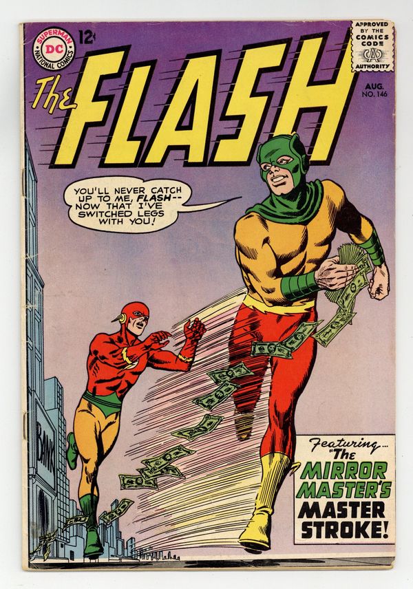 Cover pencils by Carmine Infantino, inks by Murphy Anderson. The Mirror Master's Master Stroke, script by John Broome, pencils by Carmine Infantino, inks by Joe Giella; Mirror Master steals Flash's legs and his speed. Fatal Fingers of the Flash, script by Gardner Fox, pencils by Carmine Infantino, inks by Joe Giella and Frank Giacoia; everything Flash touches turns old. Rocky and Bullwinkle star in a one-page Cheerios ad. Palisades Amusement Park ad with Superman. Trix cereal ad. Silly Putty ad. 36 Pages, Full Color. Cover price $0.12.