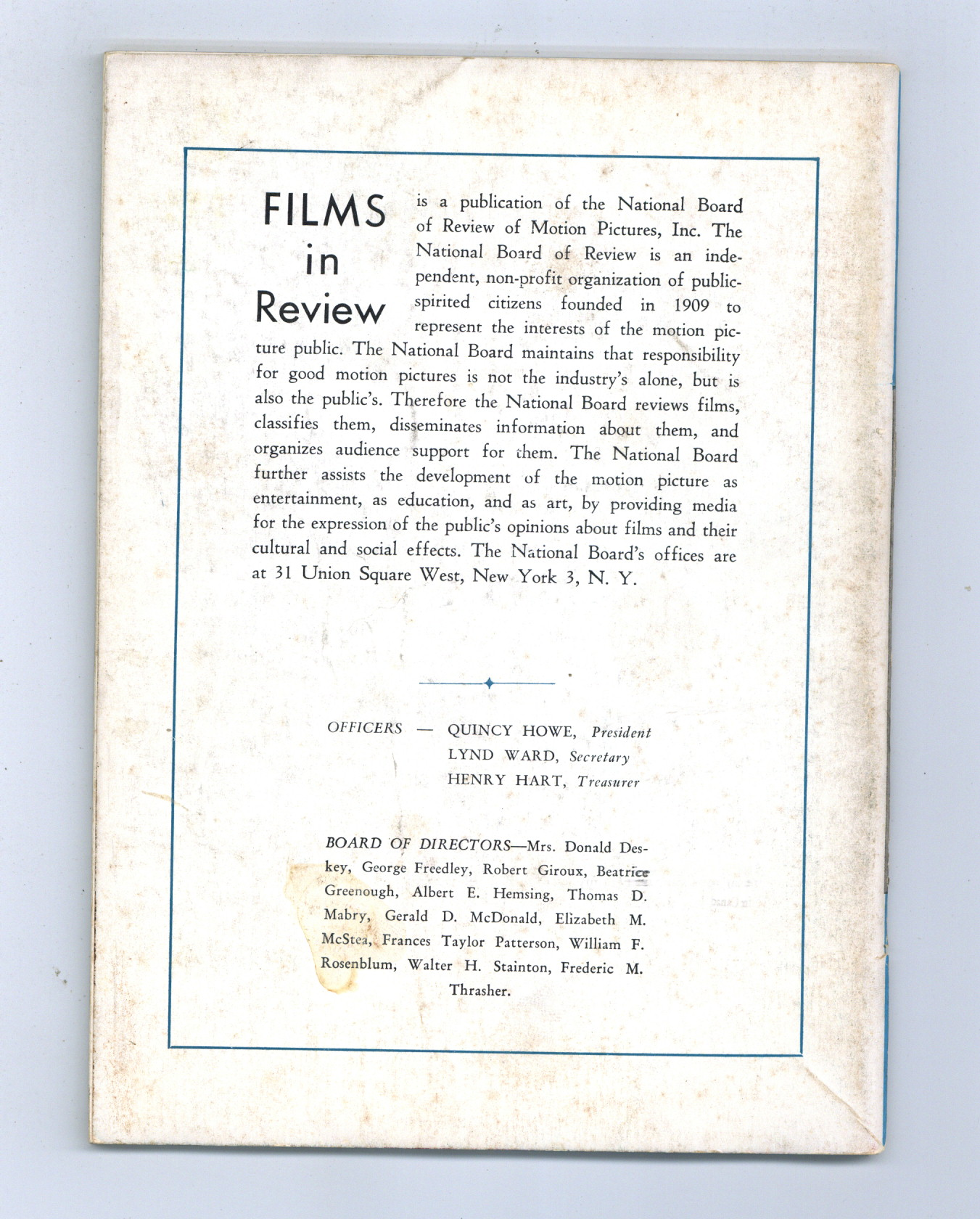 Published Jan 1962 by National Board of Review of Motion Pictures Inc..$4.00- Spine split 20%. Staple rust: Slight.