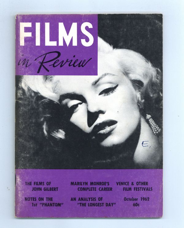 Published Oct 1962 by National Board of Review of Motion Pictures Inc..$11.00Volume 13, Issue 8 - October, 1962. Film in Review is a publication of the National Board of Review of Motion Pictures, Inc, an independent, non-profit organization of public citizens founded in 1909 to represent the interests of the motion picture public. This National Board further assists the development of the motion picture as a source of entertainment, as education, and as art, by providing media for the expression of the public's opinion about films and their cultural and social effects. This issue includes a Long 10-page article about Judy Marilyn Monroe complete with her filmography and heavily illustrated with black and white photographs. Also includes movie reviews for classics such as "Divorce", "Damn the Defiant", "The Island", "Long Day's Journey into Night", and others. Plus movie reviews and letters. 5 1/2-in. x 7 1/2-in., 70 pages, B&W. Cover price $0.60.