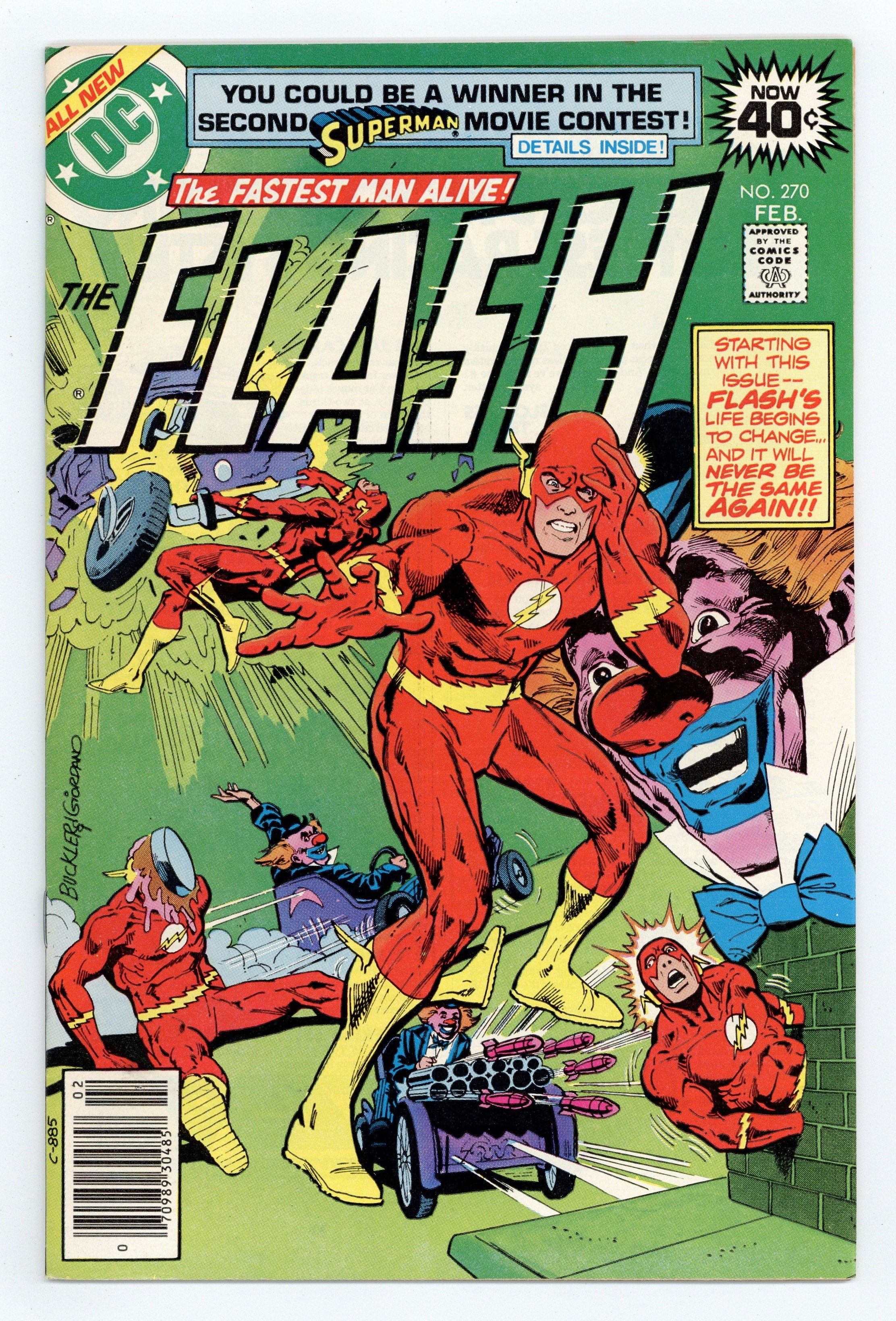 Cover pencils by Rich Buckler, inks by Dick Giordano. A Fast Way to Die, script by Cary Bates, pencils by Irv Novick, inks by Frank McLaughlin; Work and a dangerous clown get in the way of time with Iris; This begins a new era in the life of Barry Allen wherein he's beset with a host of personal problems. Ross Andru takes over as editor from the esteemed Julius Schwartz. Superman the Movie contest ad. Flash ad. Batman Family ad. Superman centerfold ad. Super-hero stick-ons ad. 36 Pages, Full Color. Cover price $0.40.