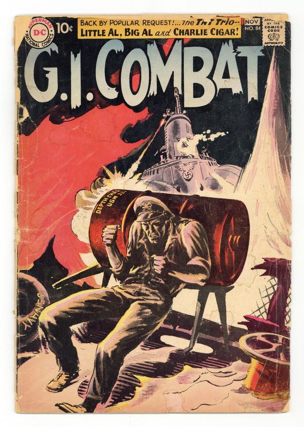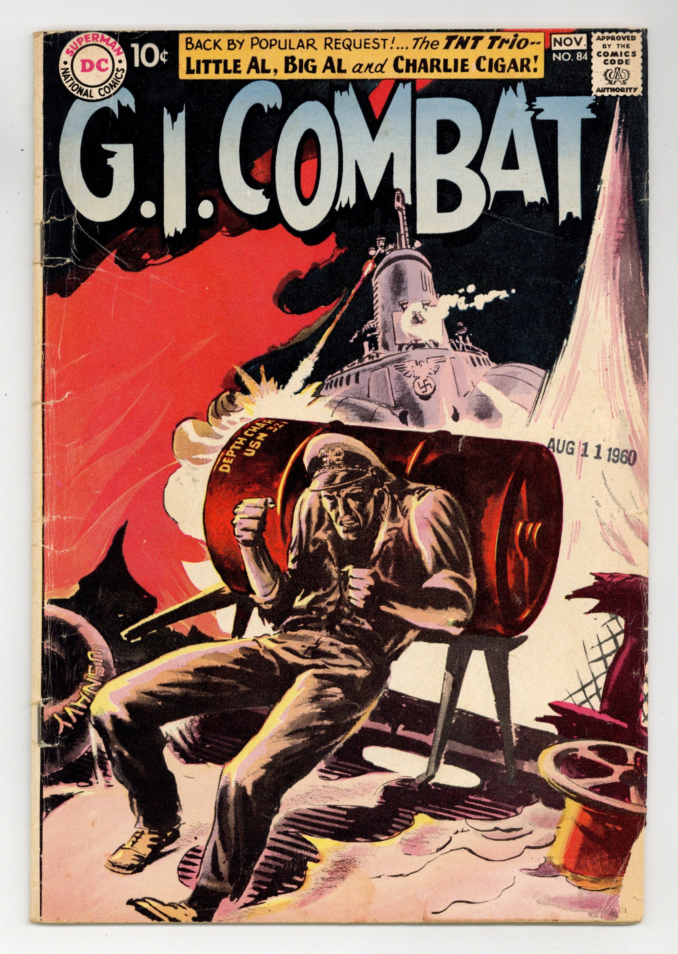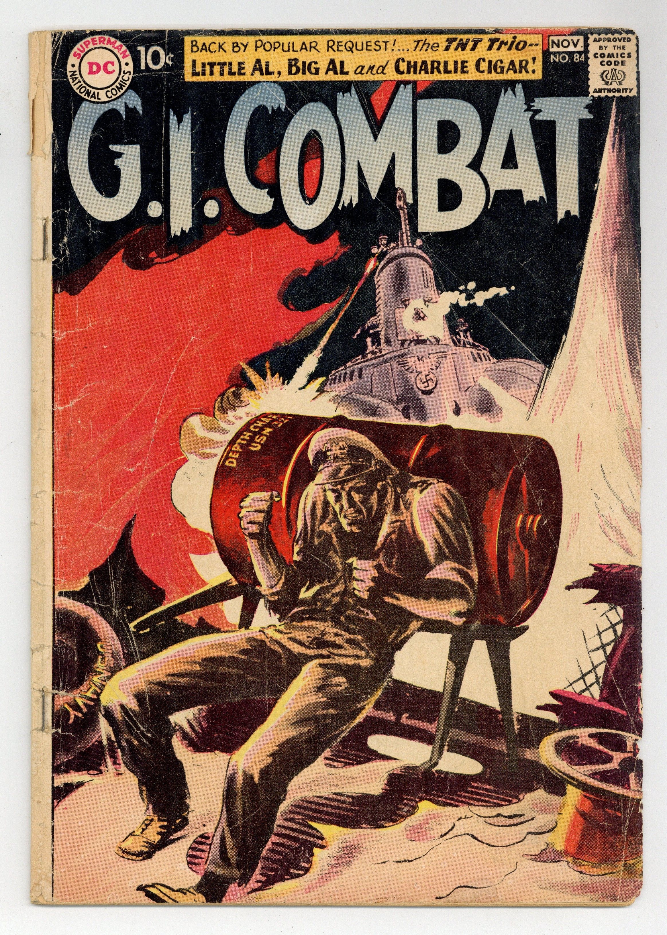 Cover by Joe Kubert and Jack Adler (washtone). Written by Robert Kanigher and Bob Haney. Art by Ross Andru, Jack Abel and Mike Esposito. Back by popular request -- the TNT Trio (Big Al, Little Al and Charlie Cigar) in "Dog Company is Holding" by Robert Kanigher, Ross Andru and Mike Esposito. Also: "Skipper of the Doomed Duck!" by Bob Haney and Jack Abel. And: "The Third One is Fatal!" by Haney and Abel. 36 Pages, Full Color. Cover price $0.10.