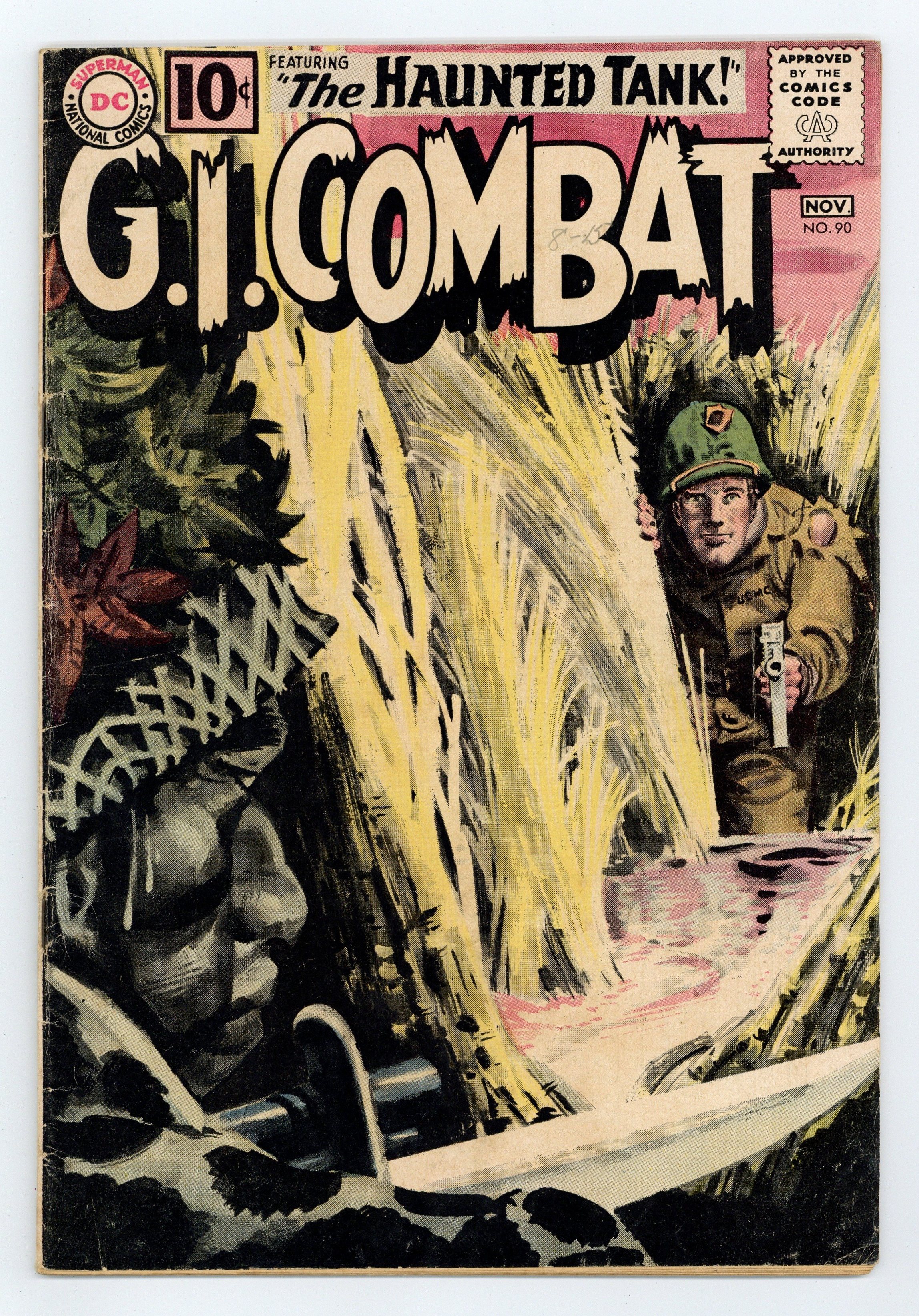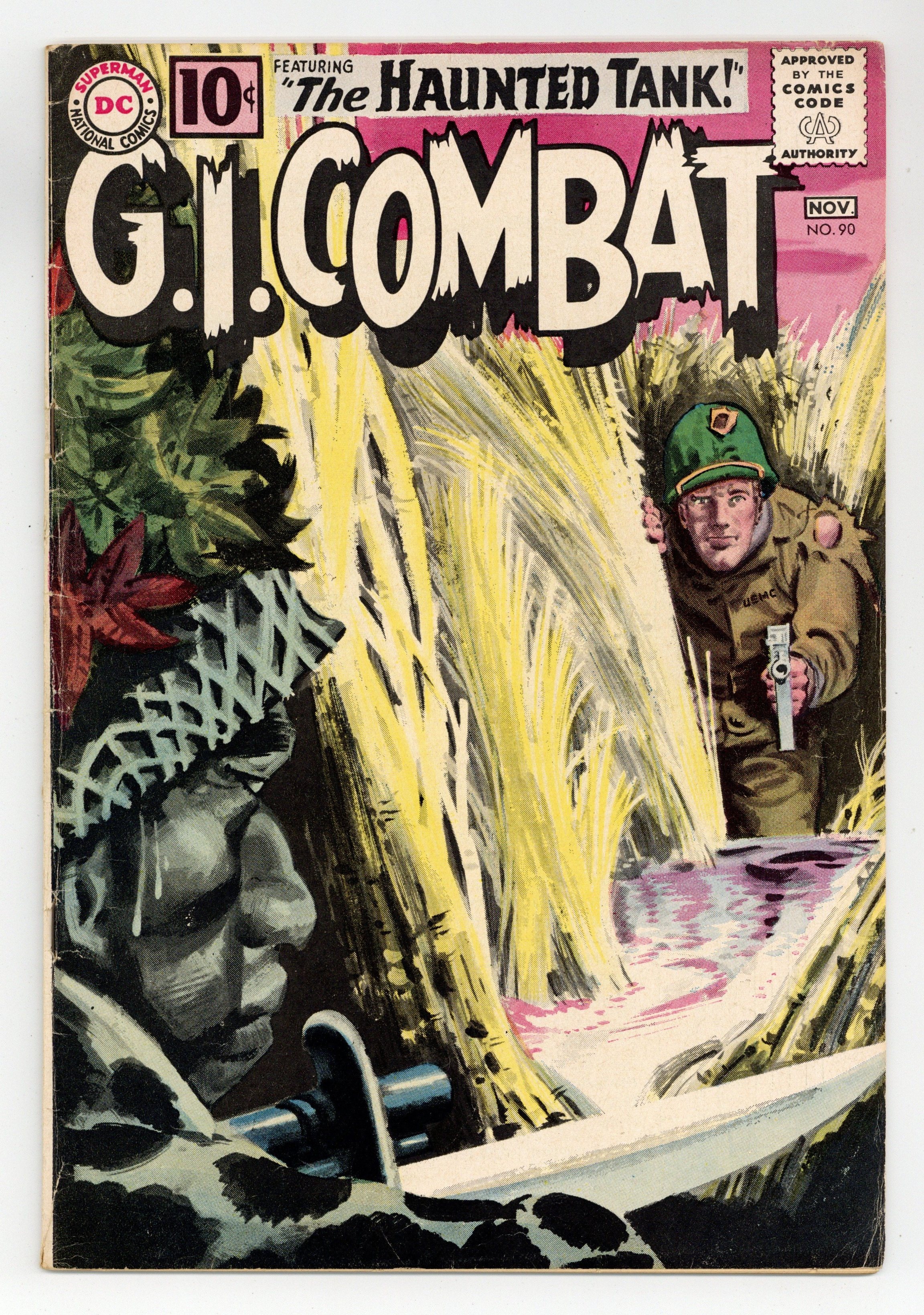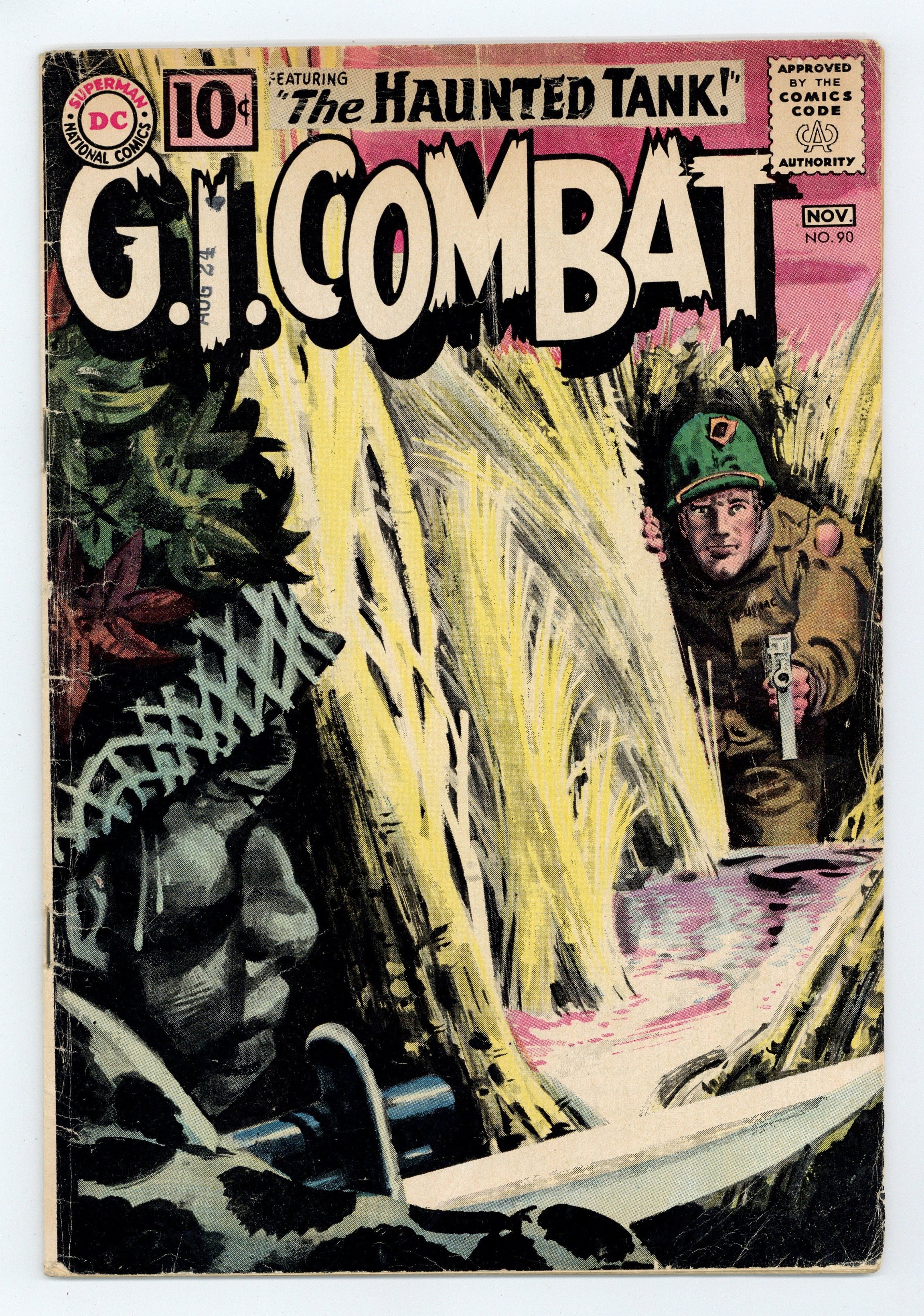 Last 10c cover-priced issue. Cover by Jerry Grandenetti and Jack Adler (washtone). Written by Robert Kanigher and Hank Chapman. Art by Russ Heath, Jack Abel and Irv Novick. When the Haunted Tank crew have their tank stolen by Germans, they must find a way to recover it and bring it home in "Tank Raiders!" by Robert Kanigher and Russ Heath. Starring the Haunted Tank, Jeb Stuart, Arch Asher, Rick Rawlins, Slim Stryker, General J.E.B. Stuart (ghost), Larry Gold, Mack Gibbon and Nick Brown. Plus: "Patrol in the Parlor!" by Hank Chapman and Jack Abel. And: "Flame Fighter!" by Chapman and Irv Novick. 36 Pages, Full Color. Cover price $0.10.