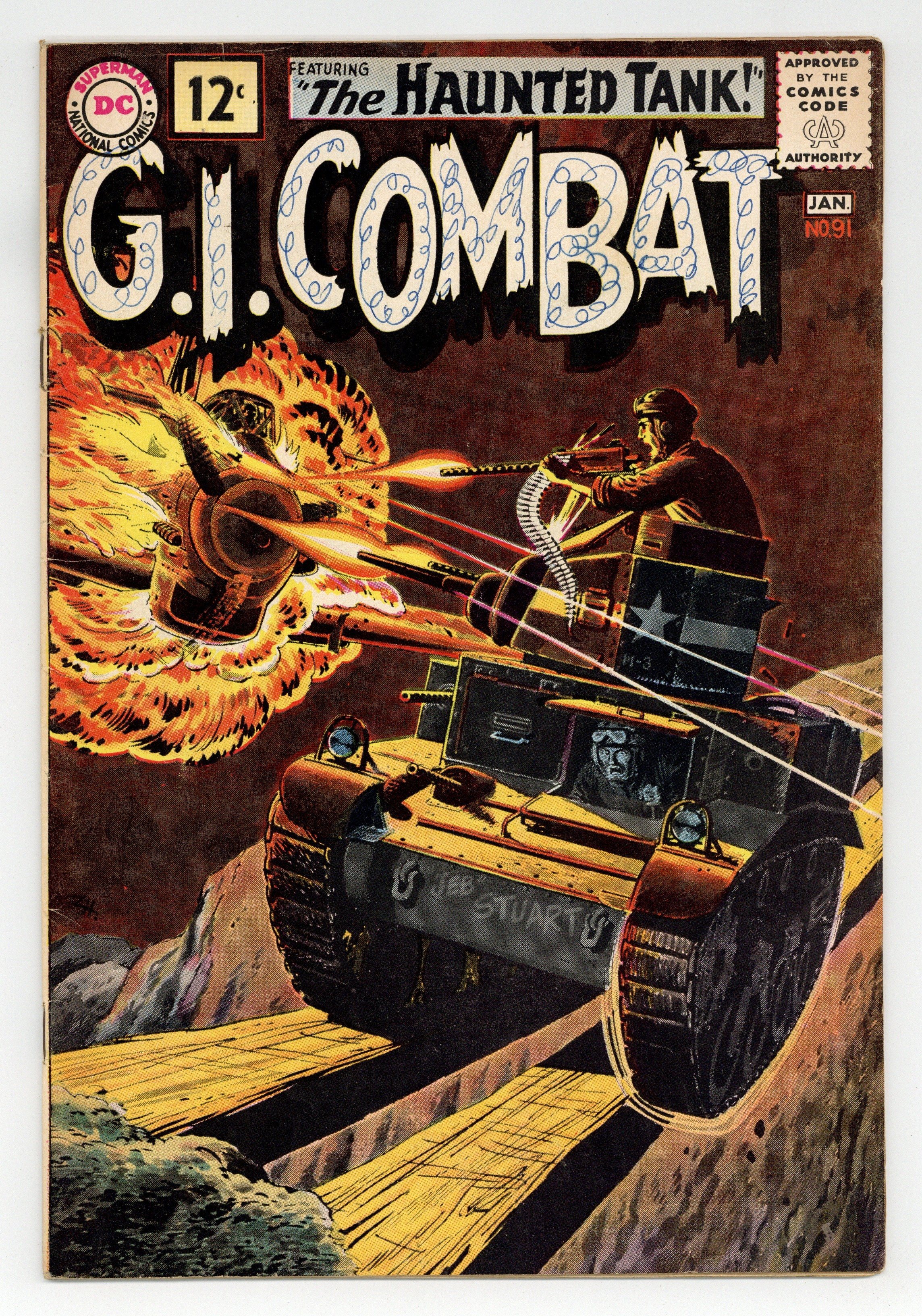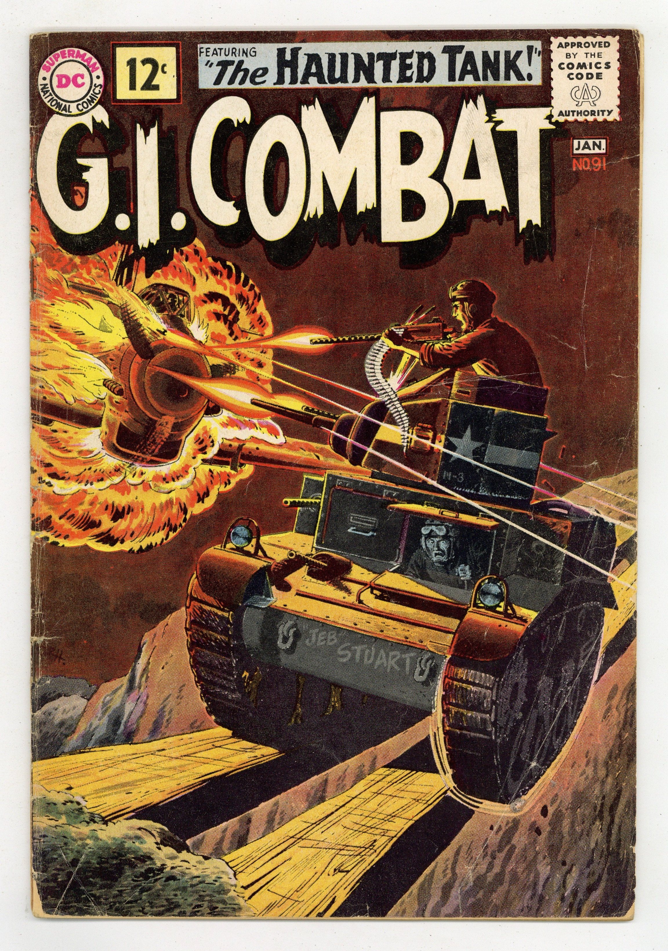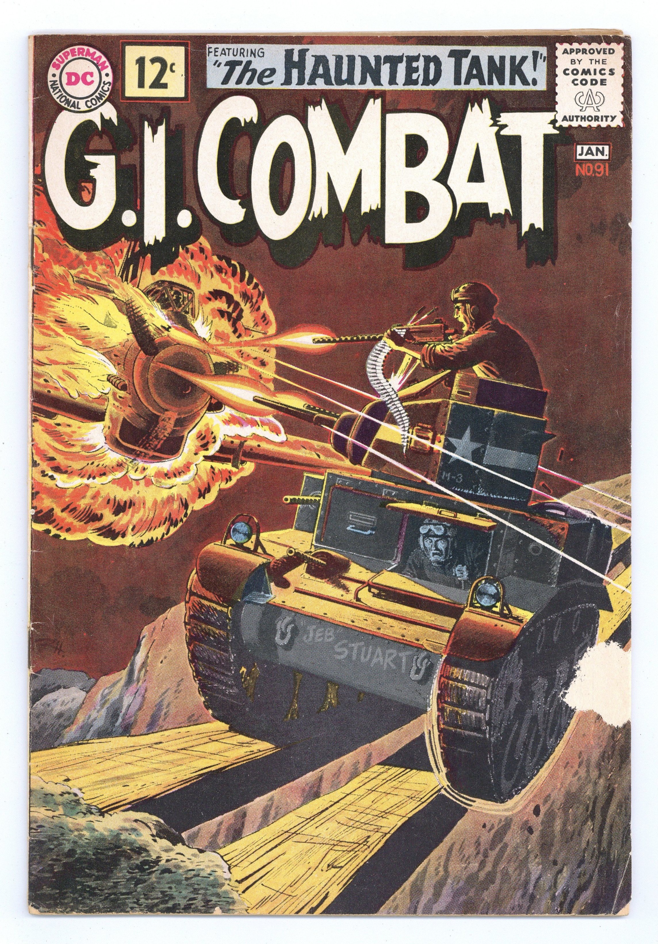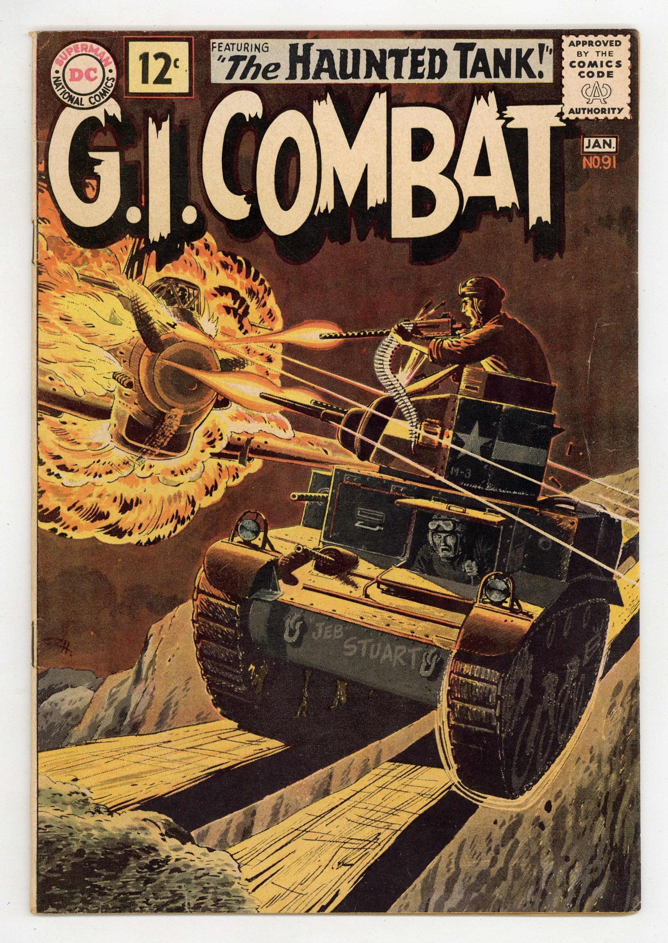 First 12c cover-priced issue. Cover by Russ Heath and Jack Adler (washtone). Written by Robert Kanigher and Bob Haney. Art by Russ Heath, Irv Novick and Jerry Grandenetti. The Haunted Tank crew helps a turtle and are in return helped by the turtle in "The Tank and the Turtle!" by Robert Kanigher and Russ Heath. Starring the Haunted Tank, Jeb Stuart, Arch Asher, Rick Rawlins, Slim Stryker and General J.E.B. Stuart (ghost). Plus: "Wings for a Wash-Out!" by Bob Haney and Irv Novick; "Secret War for a Snowbird!" by Haney and Jerry Grandenetti; and 1-pager "Marine Air Squadrons." 36 Pages, Full Color. Cover price $0.12.