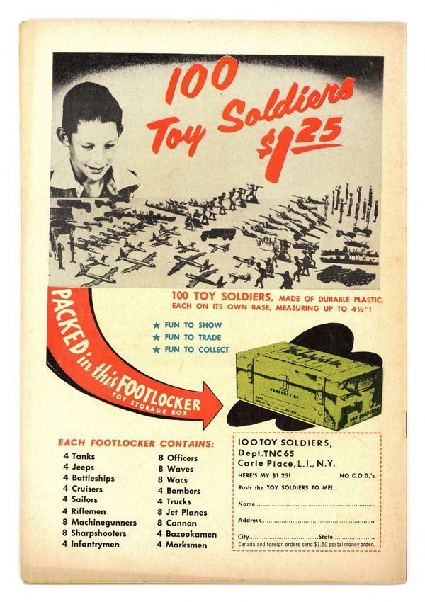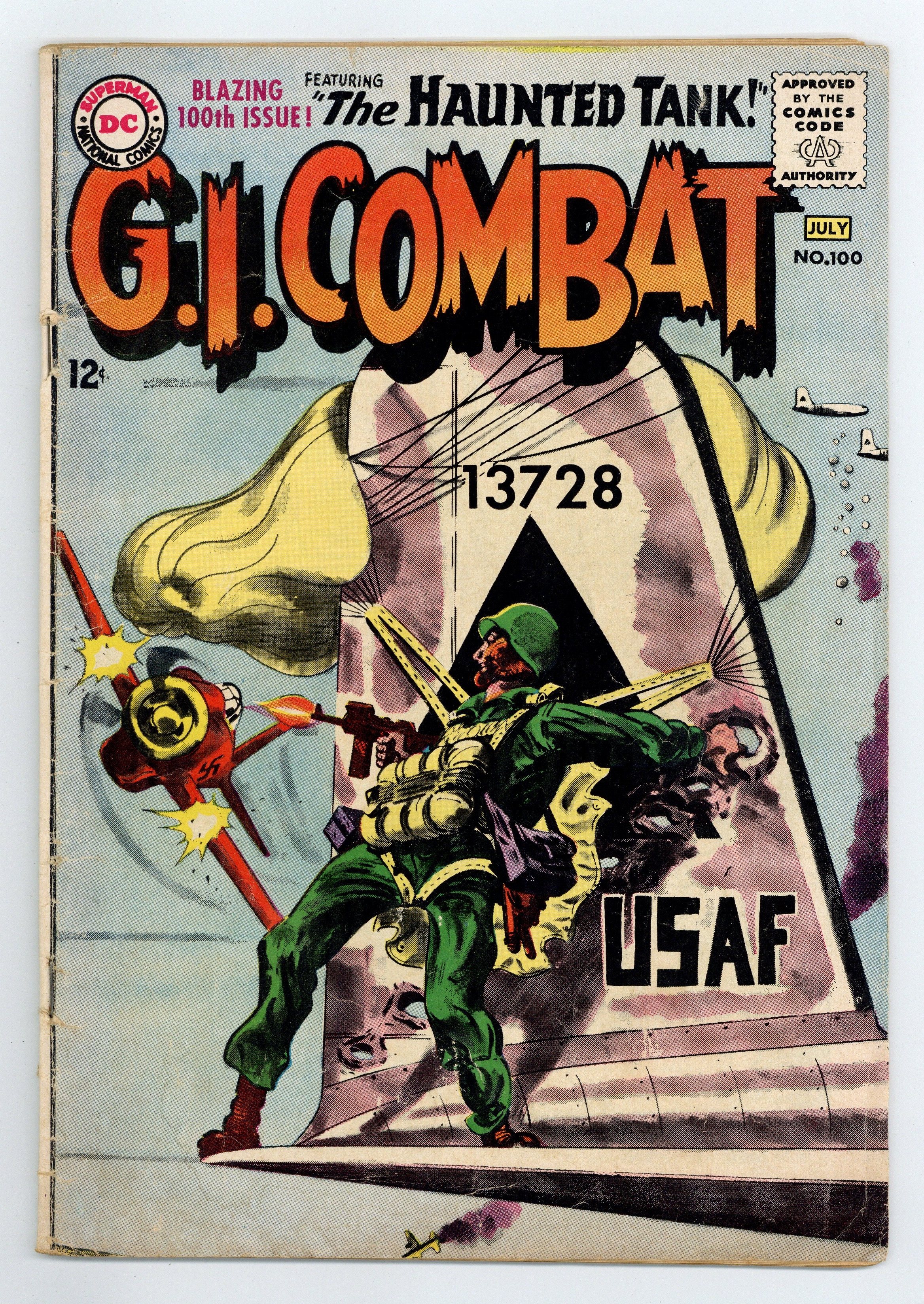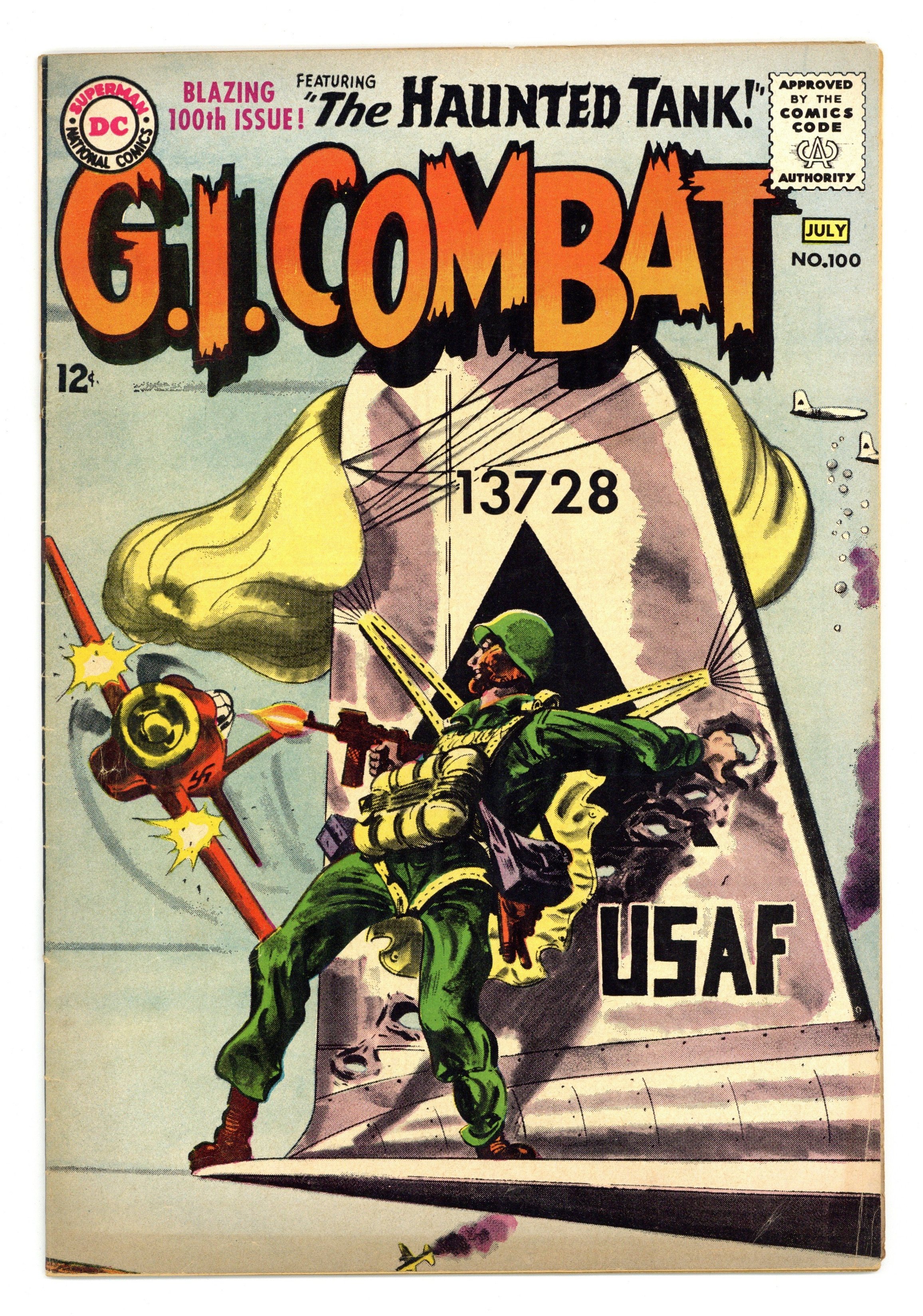 Cover by Jerry Grandenetti and Jack Adler (washtone). Written by Robert Kanigher and Bob Haney. Art by Joe Kubert, Ross Andru, Jack Abel and Mike Esposito. Blazing 100th issue! The crew of the Haunted Tank learns that their fathers had served together during WWI in one of the very first tanks in "Return of the Ghost Tank!" by Robert Kanigher and Joe Kubert. Starring the Haunted Tank, Jeb Stuart, Arch Asher, Rick Rawlins, Slim Stryker and General J.E.B. Stuart (ghost). Plus: "The Glory Box of Charlie Company!" by Bob Haney, Ross Andru and Mike Esposito. And: "The Big Jump!" by Kanigher and Jack Abel. 36 Pages, Full Color. Cover price $0.12.