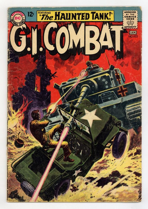 Cover by Russ Heath and Jack Adler (washtone). Written by Robert Kanigher and Ed Herron. Art by Joe Kubert and Jack Abel. The ghost of J.E.B. Stuart warns the Haunted Tank that they will learn what it is like to be the rabbit that gets used in a magic trick in "Rabbit Punch for a Tiger!" by Robert Kanigher and Joe Kubert. Starring the Haunted Tank, Jeb Stuart, Arch Asher, Rick Rawlins, Slim Stryker and General J.E.B. Stuart (ghost). Plus: "TNT Duds!" by Ed Herron and Jack Abel. And: 1-pager "Operation Strangle." 36 Pages, Full Color. Cover price $0.12.