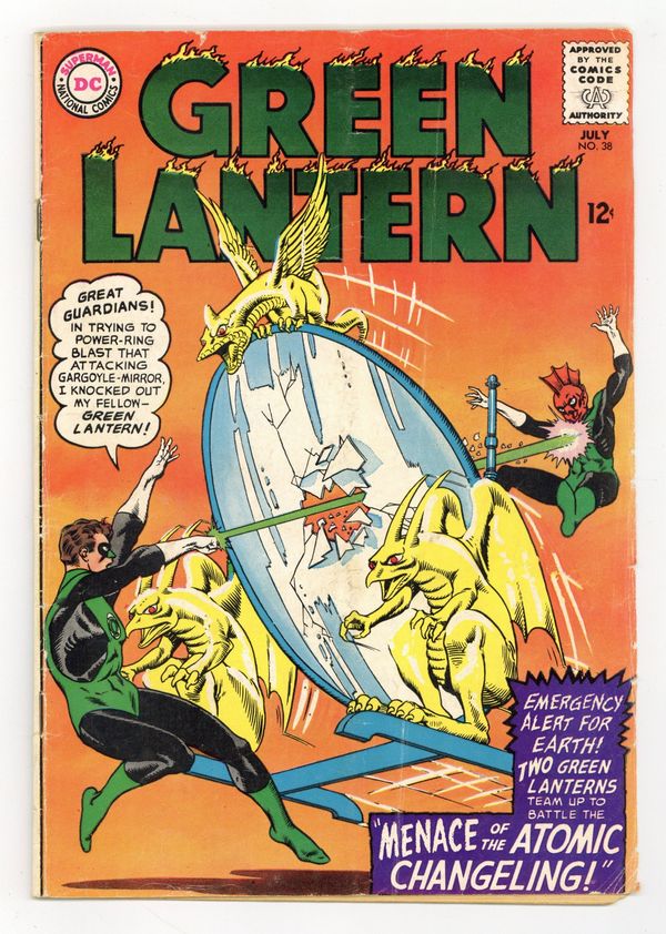 Cover pencils by Gil Kane, inks by Murphy Anderson. Menace of the Atomic Changeling!, script by Gardner Fox, pencils by Gil Kane, inks by Sid Greene; Hal Jordan is contacted by Green Lantern Tomar-Re to assist in capturing an atomic energy being who steals bodies and animates objects, and does capture the being by trapping it between object changes. Binky Shows "How to Make New Friends!" public service announcement, art by Bob Oksner. The Elixer of Invulnerability!, script by Gardner Fox, pencils by Gil Kane, inks by Sid Greene; While on vacation, Hal Jordan stumbles across and defeats Keith Kenyon, who has amassed sunken gold and created weapons and an invulnerability elixir from it. 36 pgs. $0.12. Cover price $0.12.