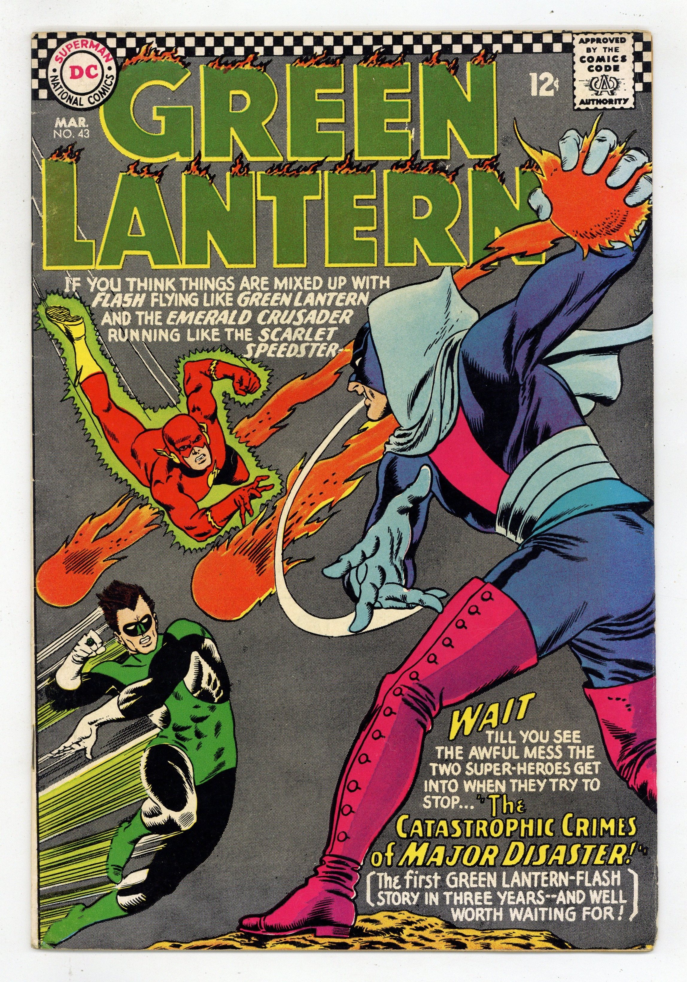 Cover pencils by Gil Kane, inks by Murphy Anderson. The Catastrophic Crimes of Major Disaster!, script by Gardner Fox, pencils by Gil Kane, inks by Sid Greene; A new villain uses disasters to committ his crimes, and Hal and Barry are having a hard time stopping him. 36 pgs. $0.12. Cover price $0.12.
