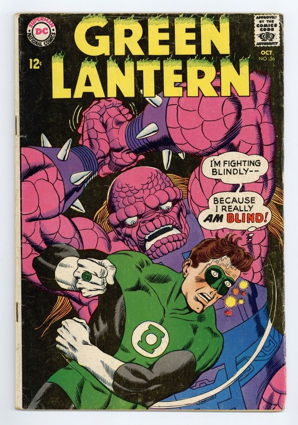 Cover pencils by Gil Kane, inks by Murphy Anderson. The Green Lanterns' Fight For Survival!, script by John Broome, art by Gil Kane; Green Lanterns Hal Jordan and Tomar-Re are assisted by newly deputized Green Lantern Charlie Vicker as they find and disable a fortress of aliens on a prison planet; The prisoners are lead by an earth criminal Al Magone, and are using one of the alien robots as the power source for Mini-Nucleo weapons that neutralize the emerald power and allows them to kill Green Lanterns across the universe. 36 pgs. $0.12. Cover price $0.12.