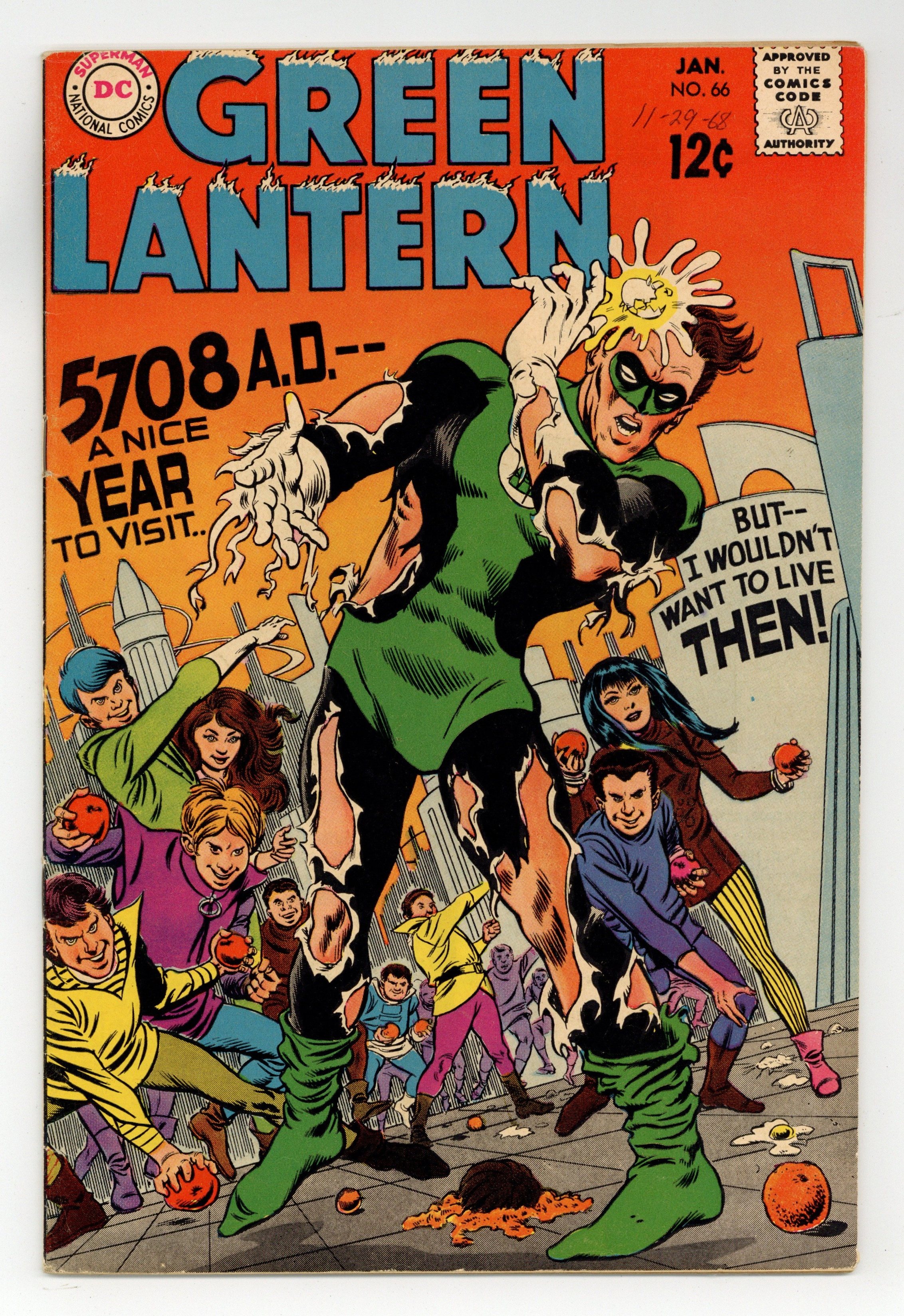 Cover pencils by Mike Sekowsky, inks by Murphy Anderson. 5708 A.D. -- A Nice Year to Visit -- But I Wouldn't Want to Live Then!, script by John Broome, pencils by Mike Sekowsky, inks by Joe Giella; Green Lantern travels again to the year 5708, where he finds his future colleagues under the mental control of two alien entities. Letters to the editor from comic writers Don McGregor, Mark Evanier, and Martin Pasko, and by writer Peter Sanderson. 36 pgs., full color. $0.12. Cover price $0.12.