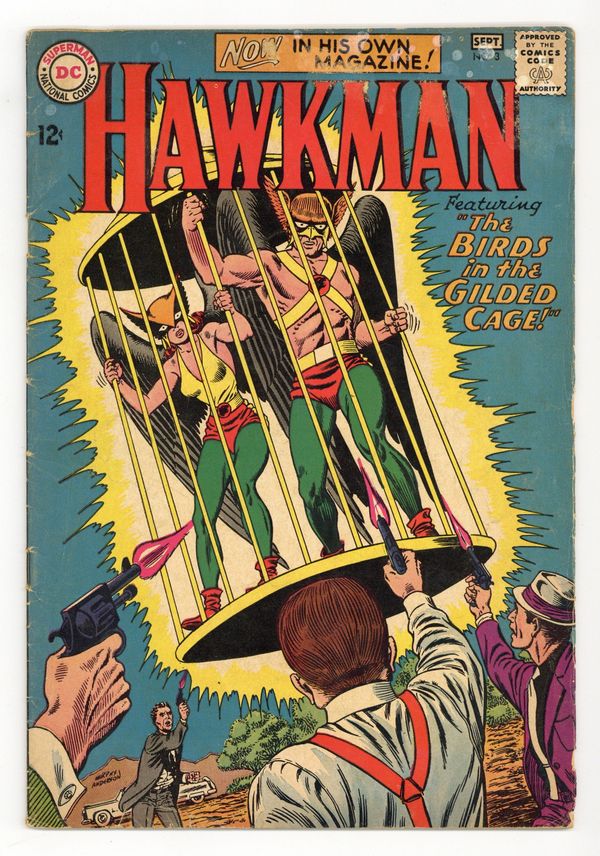 Cover art by Murphy Anderson. The Fear that Haunted Hawkman, script by Gardner Fox, art by Murphy Anderson; An ancient Eqyptian statue mysteriously causes Hawkman to fear the leader of the Sky-Raiders. Birds In the Gilded Cage, script by Gardner Fox, art by Murphy Anderson; An alien bird-creature misunderstands the Hawks' work as crimefighters and imprisons them in a cage to "protect" them from a gang of crooks. Letter to the editor from comics artist Bill Stout. 36 pgs. $0.12. Cover price $0.12.