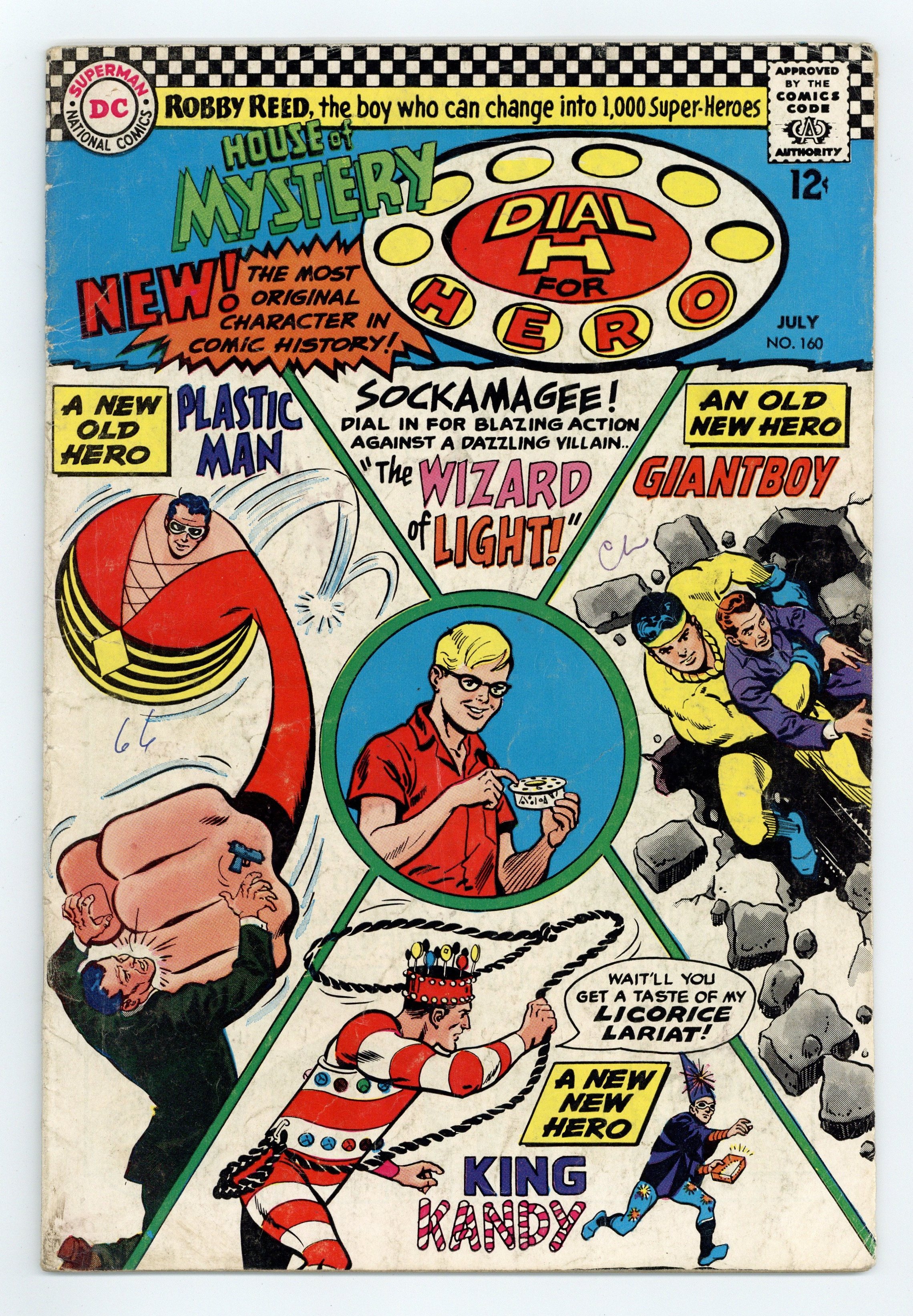 Cover art by Jim Mooney. Batman ad. 1st Silver Age appearance of Plastic Man in the Dial H for Hero story "The Wizard of Light," script by Dave Wood, art by Jim Mooney; While staying with his cousin Ned, Robby Reed uses his H-Dial to battle the villainous Wizard of Light in various super-heroic guises, including that of Plastic Man! "Natural Beauty -- Everybody's Fight" public service announcement, script by Jack Schiff; excerpts from a speech by President Lyndon Johnson regarding the preservation of nature. Teen Titans ad. Letter to the editor from Irene Vartanoff. Statement of ownership--average print run 331,000; average print run 196,677. "Manhunter's New Secret Identity" starring J'onn J'onzz Manhunter from Mars, script by Jack Miller, art by Joe Certa; Manhunter agrees to infiltrate the criminal organization called VULTURE; He assumes the identity of Marce Xavier, a European playboy who recently died in an accident but whose death was not reported. Batman and Robin ad. 36 Pages, Full Color. Cover price $0.12.
