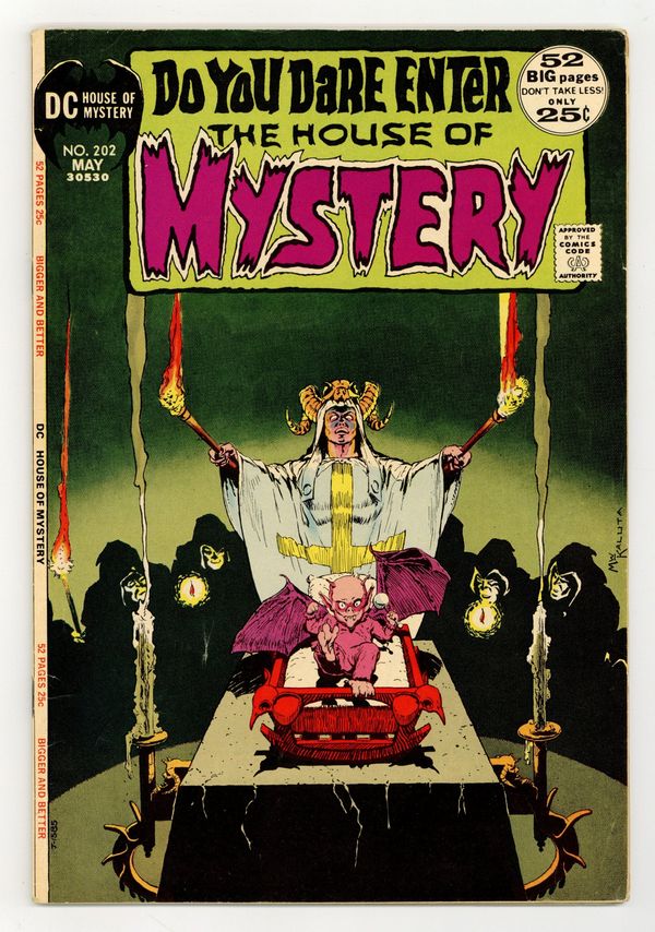 $42.00Cover art by Michael W. Kaluta. "The Shearing of a Soul!", script by Gerry Conway, pencils by Mike Sekowsky, inks by Frank Giacoia; When her husband dies, a woman makes a pact with the devil to place his mind inside their newborn son. "A Deal with a Sorcerer!", script by John Albano, art by Nestor Redondo; Franklin Owen sells his soul to become a sorcerer. "Stay Away from Me--You Might Die," art by Gene Colan; Dr. Bertrand finds a bomb from outer space but can't let go of it for fear of it exploding. 1.5-page Trick or Treat story with Adolph Hitler, art by Sid Greene. "The Poster Plague," script by Steve Skeates, art by Sergio Aragonés; Someone has been putting up outdated posters on a college campus. "The Phantom on Wheels!", art by John Prentice; Ted Perry, a debunker of supernatural claims, drives a car that was cursed by Murdock the Magician; reprinted from House of Mystery #58. 52 Pages, Full Color. Cover price $0.25.