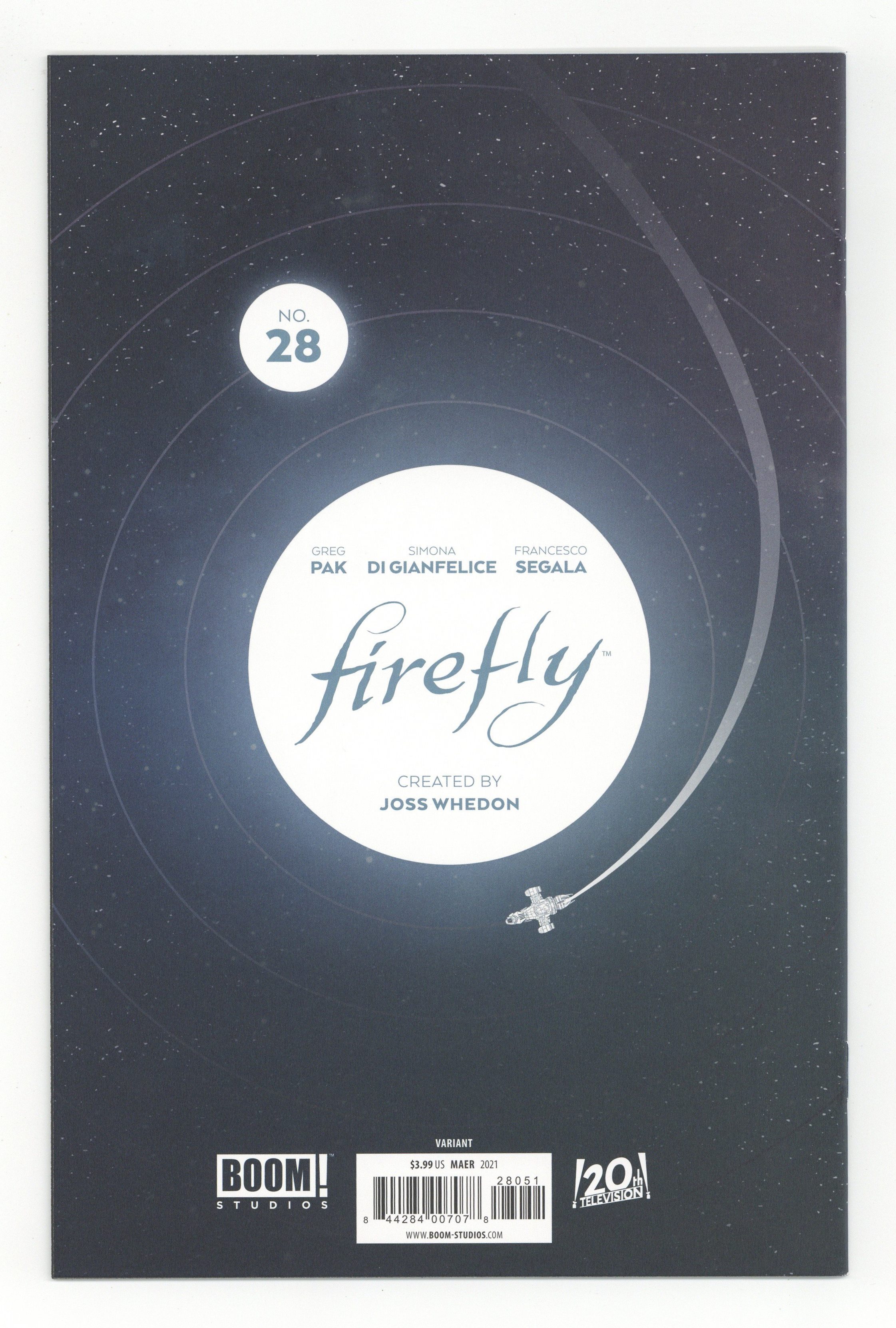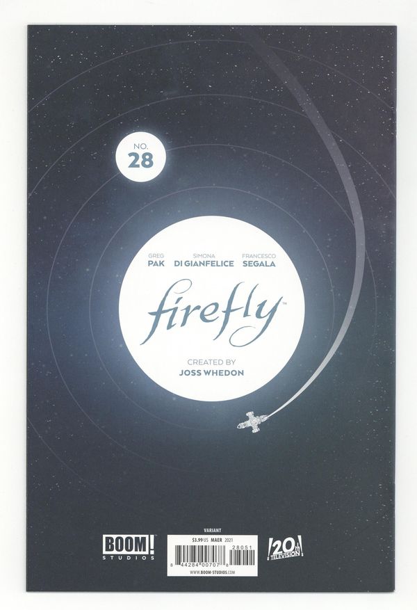 Published Apr 2021 by Boom Studios.$19.00Limited 1 for 50 Retailer Incentive Variant Cover. Written by Greg Pak. Art by Simona Di Gianfelice. Cover by Shannon Maer. New Characters! New Enemies! The new era continues, as the crew of Serenity make one last ditch effort to stop the Blue Sun's plan to close off the 'verse! But this means Kaylee must work together with the last person she expected. And when things are done, no one will be where they thought they would be... 24 pages, full color. Cover price $3.99.