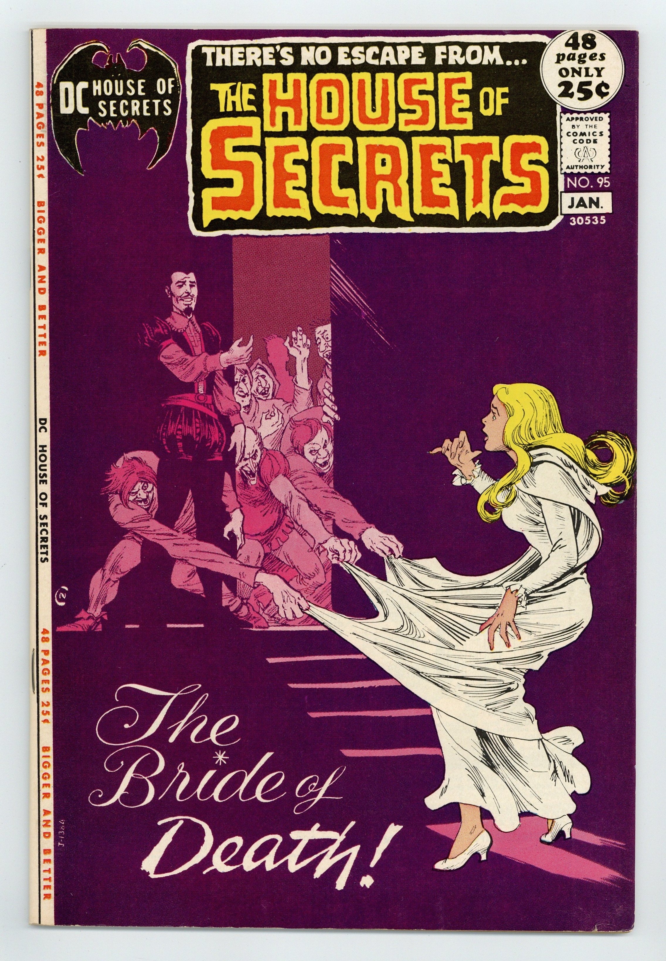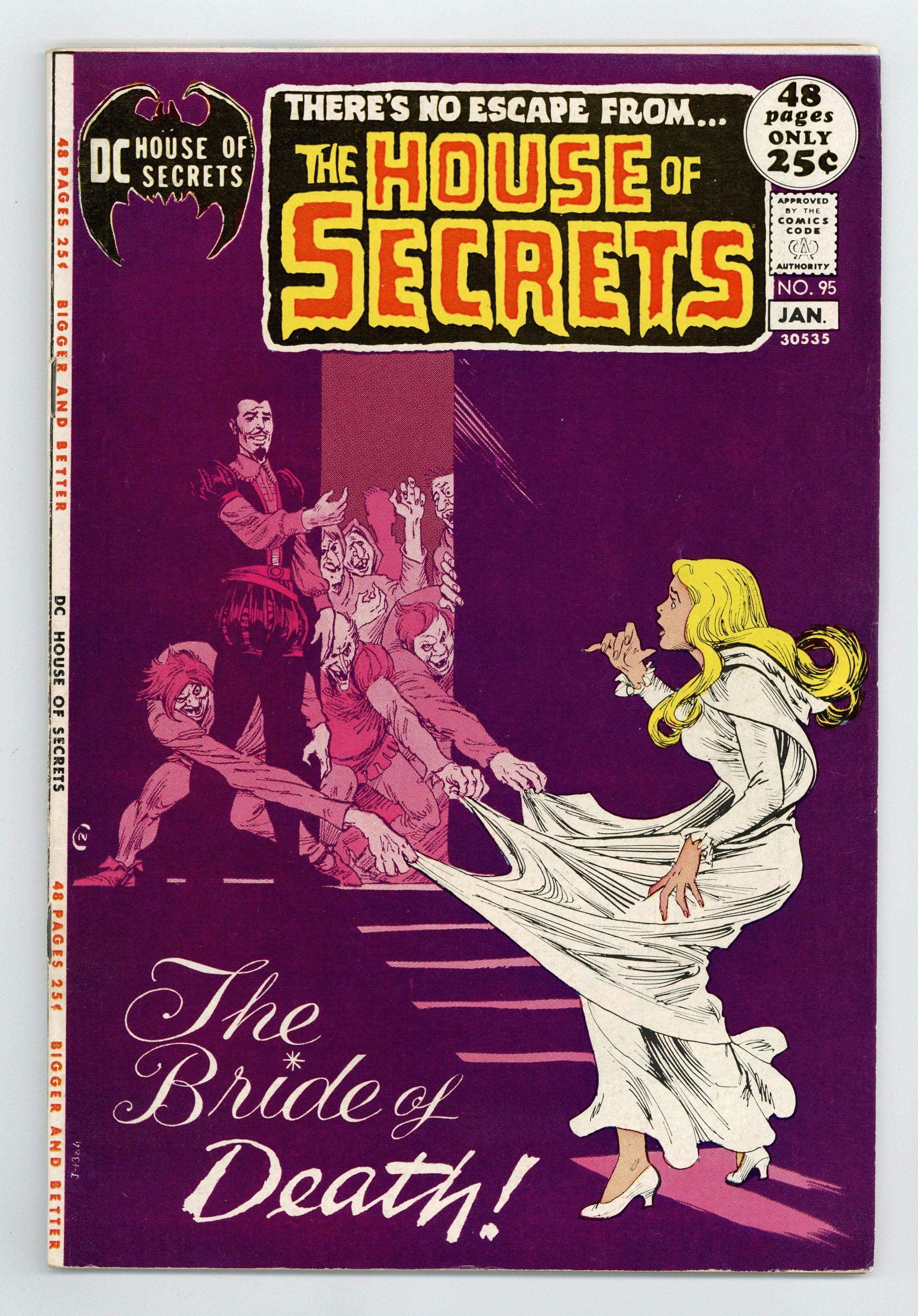 Cover art by Nick Cardy. "Creature...", script by John Albano, art by Don Heck; The lonely genius child of a surgeon puts together a patchwork playmate out of the cast off parts from his father's anatomy experiments. Abel's Fables from the House of Secrets cartoon page by Lore Shoberg. "And Things That Go Bump in the Night!", script by Len Wein; A ghost shows up when a couple calls for an exorcist to rid their house of a poltergeist; After successfully getting rid of the poltergeist the ghost tells the couple that he was glad to do it since the poltergeists give the rest of the ghosts a bad name. The Day After Doomsday one-page story, script by Len Wein, art by Jack Sparling. "The Last Sorcerer," art by Bernard Baily; Manfrey's stage magic is so remarkable because it is real magic; But in order that he not be forced to use his abilities for evil, he wills them away. "The Phantom of the Flames!", art by Joe Maneely. "The Bride of Death," script by Jack Oleck, art by Nestor Redondo; An old man tortures witches during the Spanish Inquisition for the secret of youth but they all go to their deaths cursing him that there is no such spell; One evening while busting up a witch coven he sees a young girl he becomes infatuated with; Satan appears and offers him the girl and one hundred years of youth in exchange for his soul. 52 Pages, Full Color. Cover price $0.25.