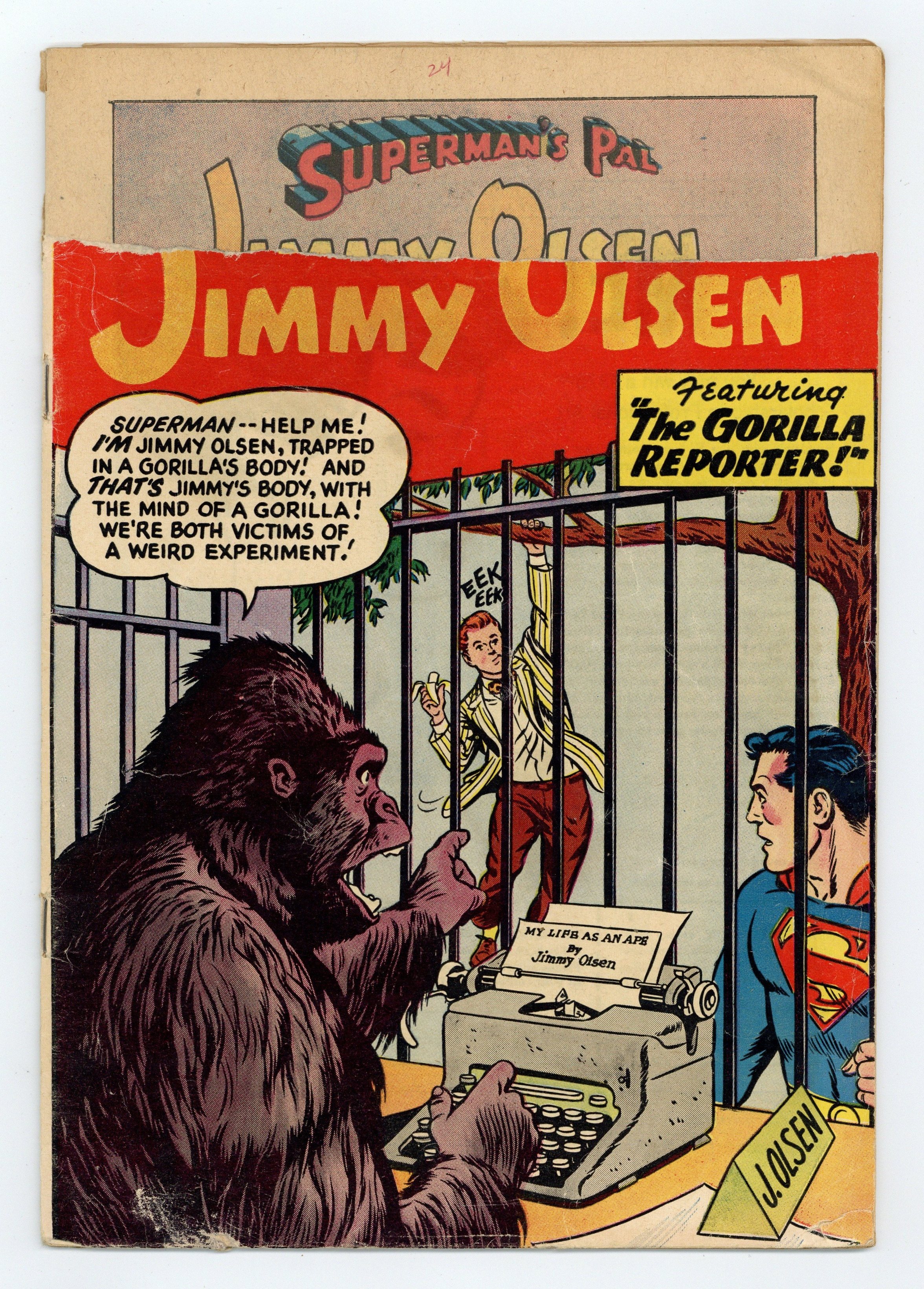 Cover pencils by Curt Swan, inks by Stan Kaye. The Superman Hall of Trophies; tour guide Jimmy Olsen accidentally exposes Superman to Kryptonite. The Luckiest Boy in the World; Jimmy believes a turban he bought at a fair is good luck. Scripts by Otto Binder, pencils by Curt Swan, inks by Ray Burnley. How NOT to Enjoy a Vacation! public service announcement, script by Jack Schiff, art by Ruben Moreira. The Gorilla Reporter; Jimmy's mind get switched out with a gorilla. So You Want to be a Veterinarian article. Tricksy humor page by Henry Boltinoff. 36 Pages, Full Color. Cover price $0.10.