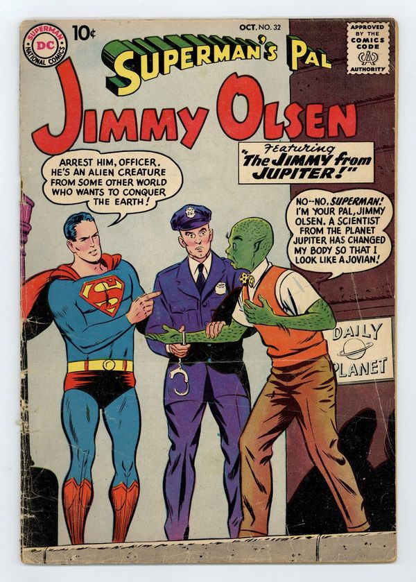 Cover pencils by Curt Swan, inks by Stan Kaye. The Super Nose for News, script by Otto Binder, pencils by Curt Swan, inks by Ray Burnley; Jimmy's nose grows when he tells a lie, ala Pinocchio. Lost -- A Free Education! public service announcement starring Binky, script by Jack Schiff, art by Bob Oksner. The Rock 'N' Roll Superman, script by Otto Binder, pencils by Curt Swan, inks by Ray Burnley. The Jimmy Olsen from Jupiter, script by Alvin Schwartz, pencils by Curt Swan, inks by Ray Burnley; Jimmy agrees to be a test subject for a week for men from Jupiter; He is granted the ability to read minds, but is also turned into a green, scaly Jovian. 36 Pages, Full Color. Cover price $0.10.