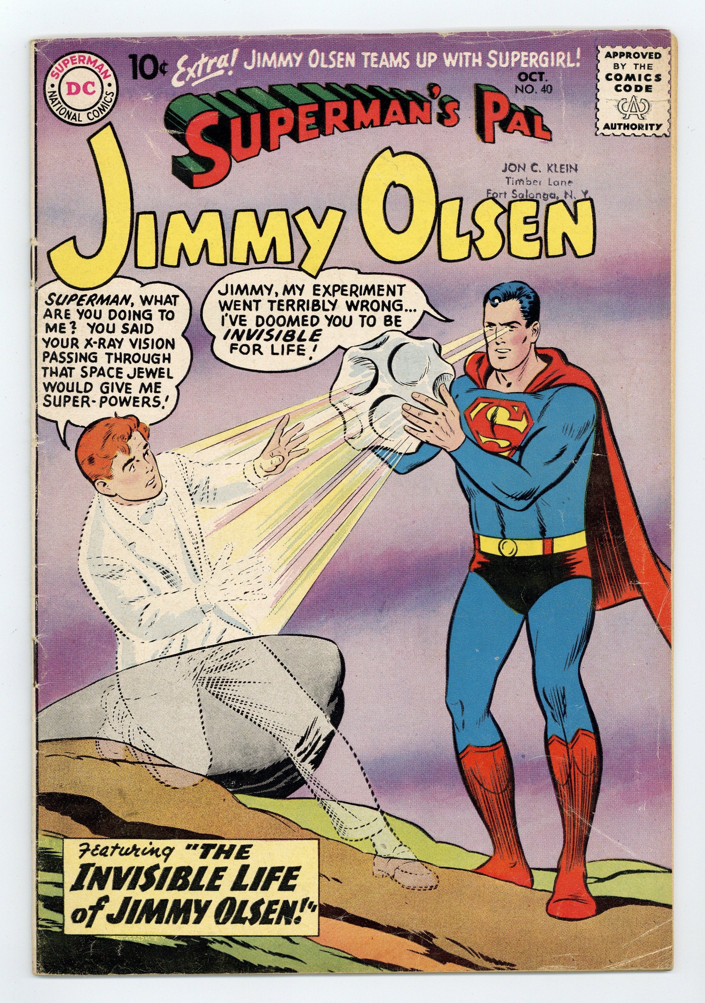 Cover pencils by Curt Swan, inks by Stan Kaye. The Invisible Life of Jimmy Olsen!, script by Otto Binder; a meteor Superman gives to Jimmy makes him invisible. Jimmy Olsen, Supergirl's Pal!, script by Otto Binder; Jimmy determines that Colonel Colby's Show of Wonders is a fraud. Jimmy Olsen, Juvenile Delinquent!, script by Robert Bernstein. Pencils by Curt Swan, inks by John Forte. 36 Pages, Full Color. Cover price $0.10.