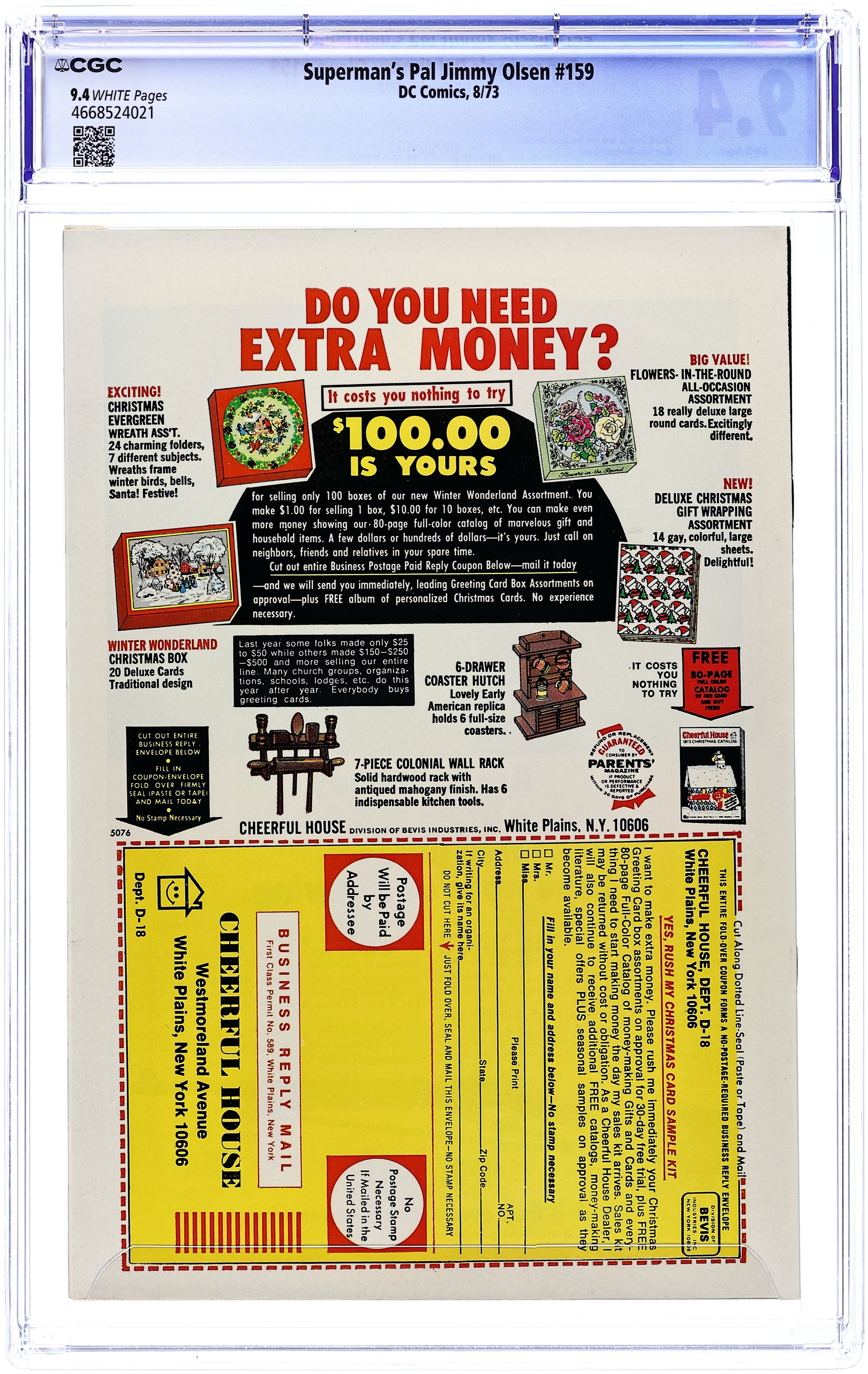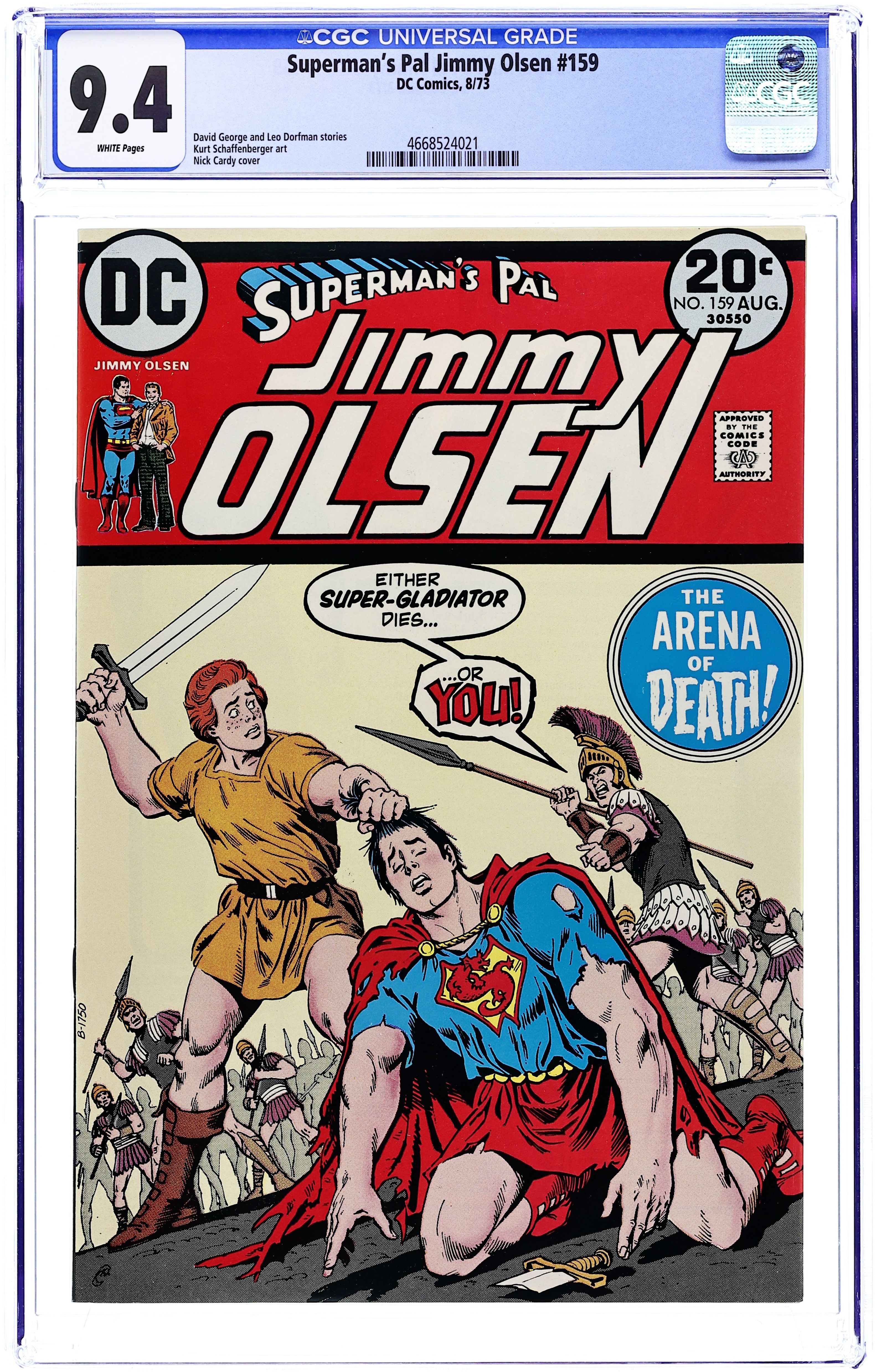 Cover art by Nick Cardy. The Arena of Death, script by Leo Dorfman, art by Kurt Schaffenberger; The Star of Cathay magically transports Jimmy back to ancient Rome where he becomes Spartacus and leads a gladiator revolt. A Grave-Digger for Jimmy Olsen, script by Leo Dorfman [as David George], art by Kurt Schaffenberger; Lena Lawrence accidentally saves Jimmy Olsen from three different attempts to end his life by the gang named Gravediggers Inc. The Day They Unmasked Mr. Action, script by Leo Dorfman [as David George], art by Kurt Schaffenberger. 36 Pages, Full Color. Cover price $0.20.