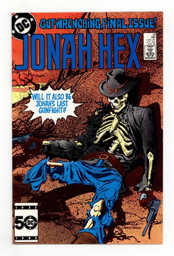 Direct Edition. In this last issue of Jonah Hex, Jonah goes out in "A Blaze of Glory!" Hex faces off with villains in the West when he suddenly disappears from the late 1880's and reappears in the 21st century sometime after a nuclear war. Continues in Hex (1985) #1. Written by Michael Fleisher, with art by Gray Morrow. Cover by Denys Cowan and Klaus Janson. Cover price $0.75.