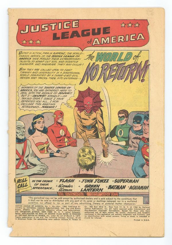 Cover art by Murphy Anderson. The World of No Return!, script by Gardner Fox, pencils by Mike Sekowsky, inks by Bernard Sachs; The Flash must beat Despero in a strange chess-like game to save the other members of the Justice League and the people of Despero's home dimension, Kalanor. Letter to the editor from comic writer Roy Thomas. 36 pgs. $0.10. Cover price $0.10.