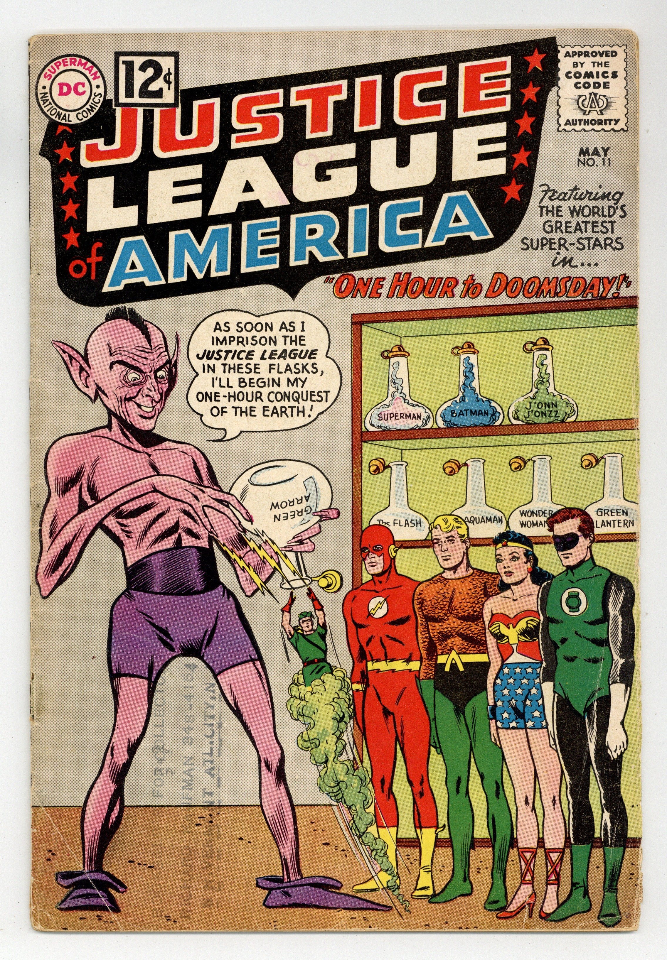 Cover pencils by Mike Sekowsky, inks by Murphy Anderson. One Hour to Doomsday!, script by Gardner Fox, pencils by Mike Sekowsky, inks by Bernard Sachs; The League chases the Lord of Time into the future, but when they try to return, they find themselves unable to go anywhere earlier than 2062. Letter to the editor from E. Nelson Bridwell. 36 pgs. $0.12. Cover price $0.12.