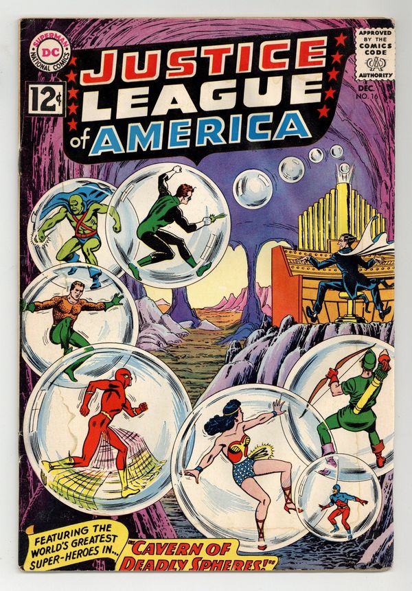 Cover art by Murphy Anderson. Cavern of Deadly Spheres, script by Gardner Fox, pencils by Mike Sekowsky, inks by Bernard Sachs; The Maestro uses mind-control music to orchestrate his crimes and capture the JLA, but he overlooks one tiny thing...the Atom! 36 pgs. $0.12. Cover price $0.12.