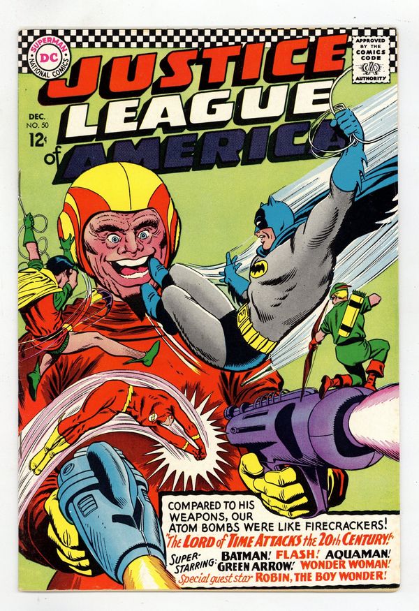 Special guest star: Robin. "The Lord of Time Attacks the 20th Century!" with story by Gardner Fox, art by Mike Sekowsky and inks by Sid Greene. Can the Justice League of America stop a foe that posseses the greatest array of war weapons since the beginning and end of time? Find out as Robin, Aquaman, Batman, Flash, Green Lantern, Wonder Woman and good ol' Snapper Carr take on the hi tech time terror known as the Lord of Time. Cover price $0.12.
