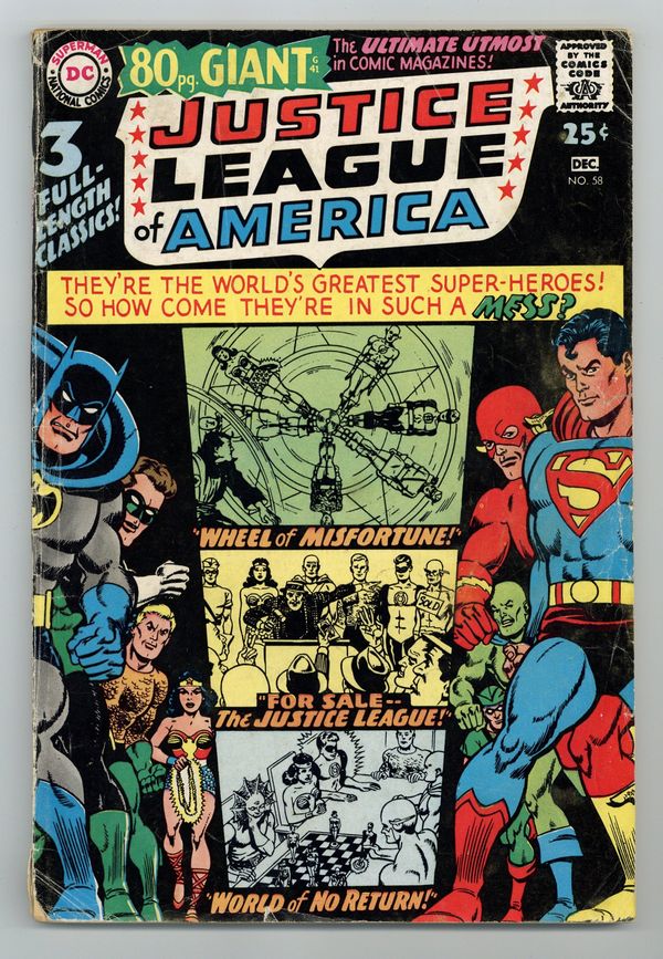 $15.50Cover pencils by Carmine Infantino, inks by Sid Greene. Reprints. The World of No Return!, script by Gardner Fox, pencils by Mike Sekowsky, inks by Bernard Sachs; The Flash must beat Despero in a strange chess-like game to save the other members of the Justice League and the people of Despero's home dimension, Kalanor. The Wheel of Misfortune!, script by Gardner Fox, pencils by Mike Sekowsky, inks by Bernard Sachs. For Sale--the Justice League!, script by Gardner Fox, pencils by Mike Sekowsky, inks by Bernard Sachs. Full page inside back cover ad for "The Best of DC on TV!" featuring the 1967 Superman-Aquaman Hour and the Batman live action show appearing Thursdays on ABC at 7:30 PM. 84 pgs. $0.25. Cover price $0.25.