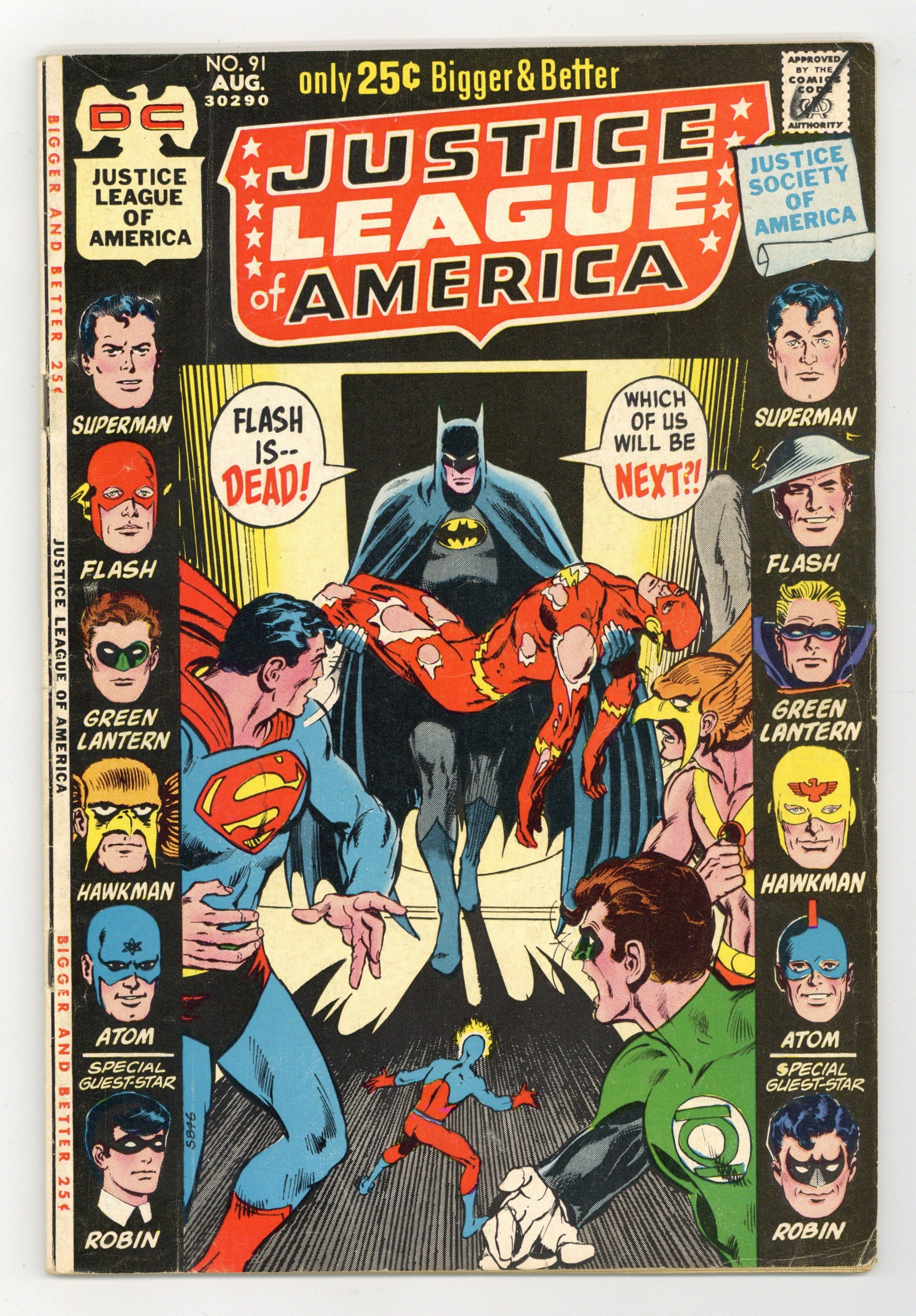 $10.25Cover art by Neal Adams. Earth-- The Monster-Maker!, script by Mike Friedrich, pencils by Dick Dillin, inks by Joe Giella; Three aliens are out on a joyride alongside their symbiotic pets when they lose control of their ship, resulting in one of the aliens being separated from his pet as they travel through the dimensional barrier separating Earths 1 and 2; As the JSA face off vs. the Alien A-Rym, he defeats them, as a result of the adult Robin charging in headstrong. Meanwhile, on Earth-1, as Batman leaves the JLA for another case he's working on, young college-aged Robin faces off alongside the team vs. Teppy, A-Rym's symbiotic pet, with the same actions and consequences; This results in Robin's uniform being torn up. The Day the World Melted featuring Knights of the Galaxy, script by Robert Kanigher, pencils by Carmine Infantino, inks by Joe Giella. The Hour Hourman Died! starring Hourman, script by Gardner Fox, pencils by Dick Dillin, inks by Sid Greene. Letter from editorial director Carmine Infantino on the inflation in the USA and National Publications raising the price of its comics. Harlan Ellison controversy in this issue.52 pgs. $0.25. Cover price $0.25.
