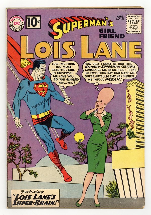 Tags: Superman$28.00Cover pencils by Curt Swan, inks by Sheldon Moldoff. Lois Lane's Super-Brain!, script by Robert Bernstein, art by Kurt Schaffenberger; After tampering with Professor Holt's brain machine Lois gives herself super-intelligence, but also makes her head grow out of proportion with her body. House ad for Superman Annual #3. House ad for Secret Origins #1. The Battle of the Sisters!, pencils by Curt Swan, inks by Stan Kaye; Lois is shocked when Superman asks Lucy Lane to marry him. House ad for Batman Annual #1. The Last Days of Lois Lane!, script by Robert Bernstein, art by Kurt Schaffenberger; Lois believes she's got less than a week to live due to radiation poisoning and tries to get stories that no other reporter would attempt. 36 Pages, Full Color. Cover price $0.10.