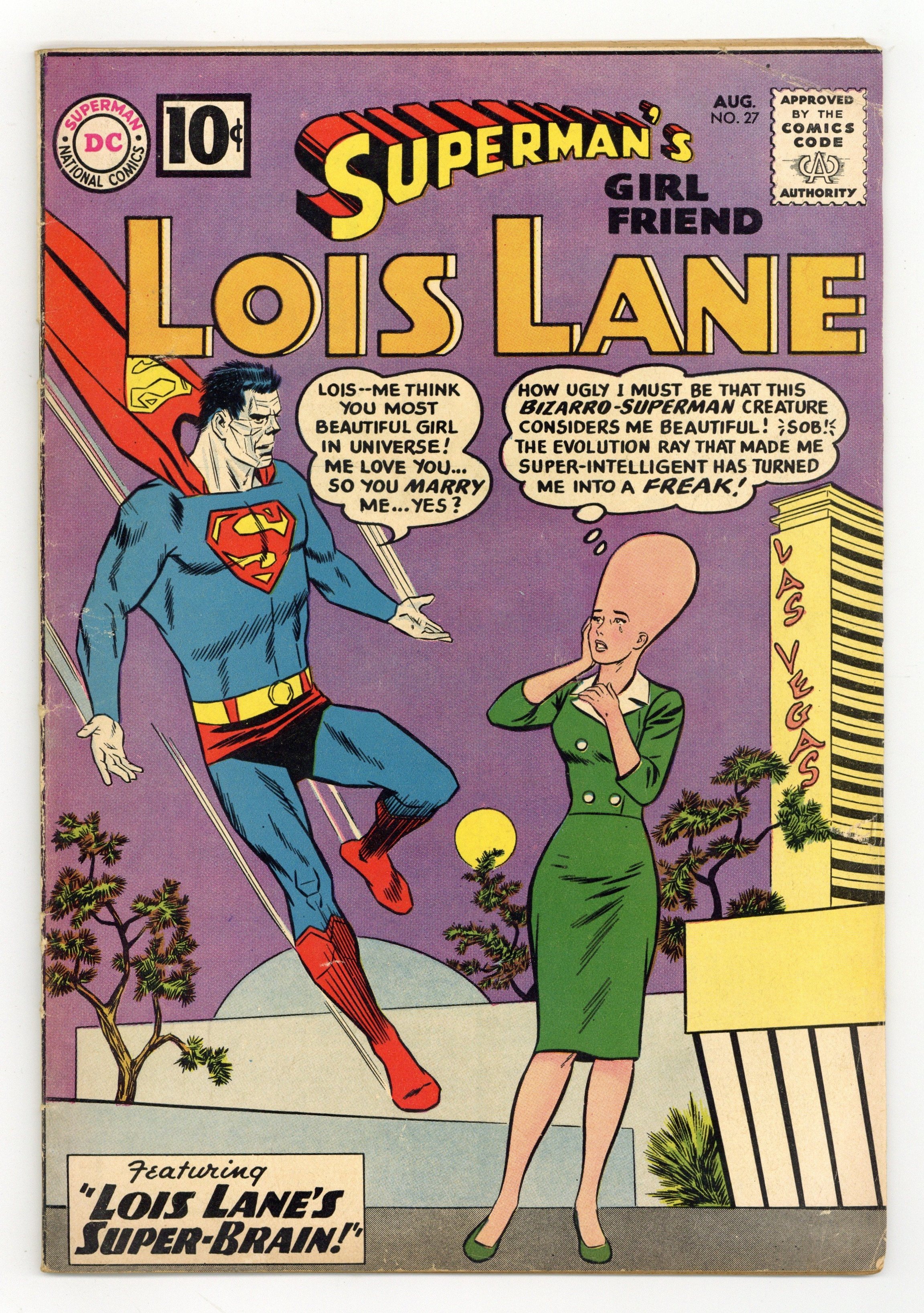 Cover pencils by Curt Swan, inks by Sheldon Moldoff. Lois Lane's Super-Brain!, script by Robert Bernstein, art by Kurt Schaffenberger; After tampering with Professor Holt's brain machine Lois gives herself super-intelligence, but also makes her head grow out of proportion with her body. House ad for Superman Annual #3. House ad for Secret Origins #1. The Battle of the Sisters!, pencils by Curt Swan, inks by Stan Kaye; Lois is shocked when Superman asks Lucy Lane to marry him. House ad for Batman Annual #1. The Last Days of Lois Lane!, script by Robert Bernstein, art by Kurt Schaffenberger; Lois believes she's got less than a week to live due to radiation poisoning and tries to get stories that no other reporter would attempt. 36 Pages, Full Color. Cover price $0.10.