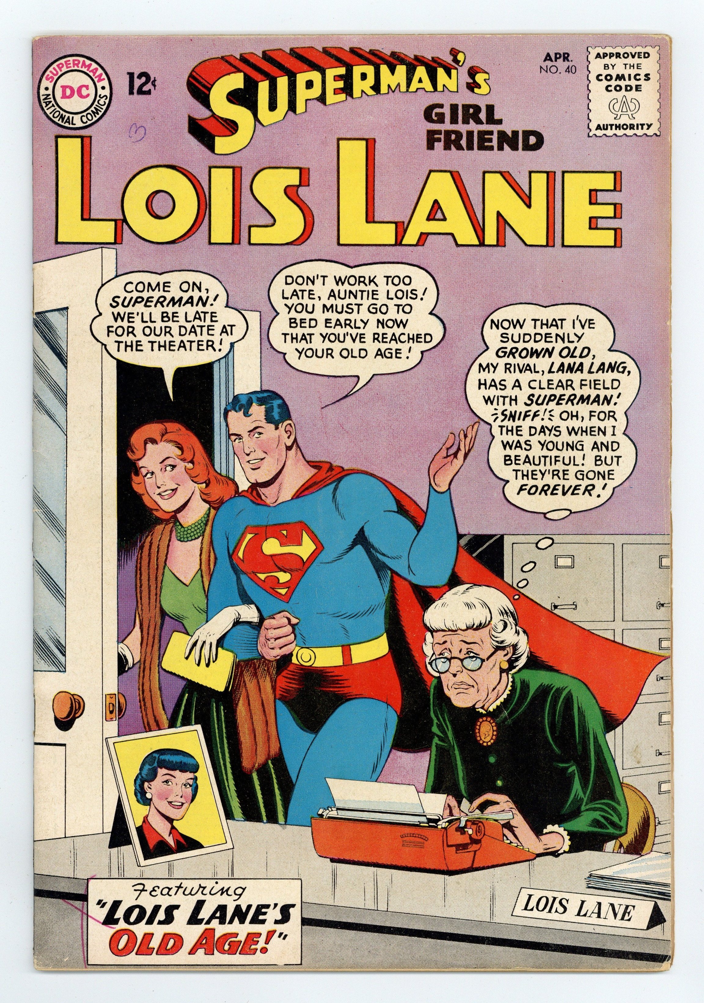 Cover art by Kurt Schaffenberger. Lois Lane, Hag!, art by Kurt Schaffenberger; Lois sets out to expose a fountain-of-youth formula as a hoax, but then she is turned into an old hag. Salute to Our Fellow Citizens of Puerto Rico! public service announcement, script by Jack Schiff. Lois Lane, Foreign Correspondent!, art by Kurt Schaffenberger; Lois is made to believe that she married a duke while on assignment in Brozna, but the duke turns out to be a murderer who is seeking to escape to the United States as the husband of an American citizen. The Lana Lang of 500 B.C.!, art by Kurt Schaffenberger; At a museum opening, Lois finds Circe's magic wand and is accidentally transported into the past where she meets the hero Achilles, who has Superman's invulnerabiity, and Ilya, a girl who resembles her rival Lana Lang. 36 Pages, Full Color. Cover price $0.12.