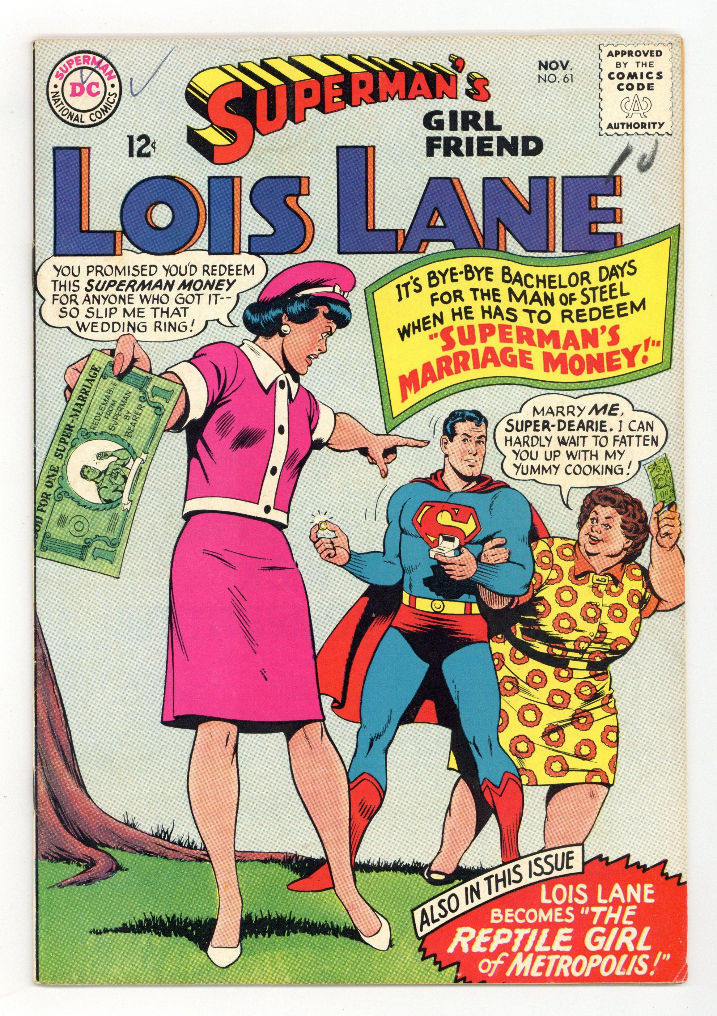 Cover art by Kurt Schaffenberger. Superman's Marriage Money!, script by Otto Binder, art by Kurt Schaffenberger; Mxyzptlk tricks Superman into doing super-feats by passing out "Superman Money" that can be redeemed for a Super Feat. Lois receives one that allows her to marry Superman. Ad for AMT models. Rocky and Bullwinkle Cheerios ad. The Hip Way to Learn! public service announcement, script by Jack Schiff, art by Sheldon Moldoff. The Reptile Girl of Metropolis!, script by Leo Dorfman, art by Kurt Schaffenberger; The world believes that Lois has been turned into a reptile girl during an accident during a nuclear test, but she has in fact been kidnapped and replaced with an impostor. The Secret of the Reptile Girl! [The Reptile Girl of Metropolis! Part II]; Lois learns who kidnapped and replaced her with an impostor that appeared to have reptilian skin. Rocky and Bullwinkle star in a one-page Cheerios ad. 36 Pages, Full Color. Cover price $0.12.