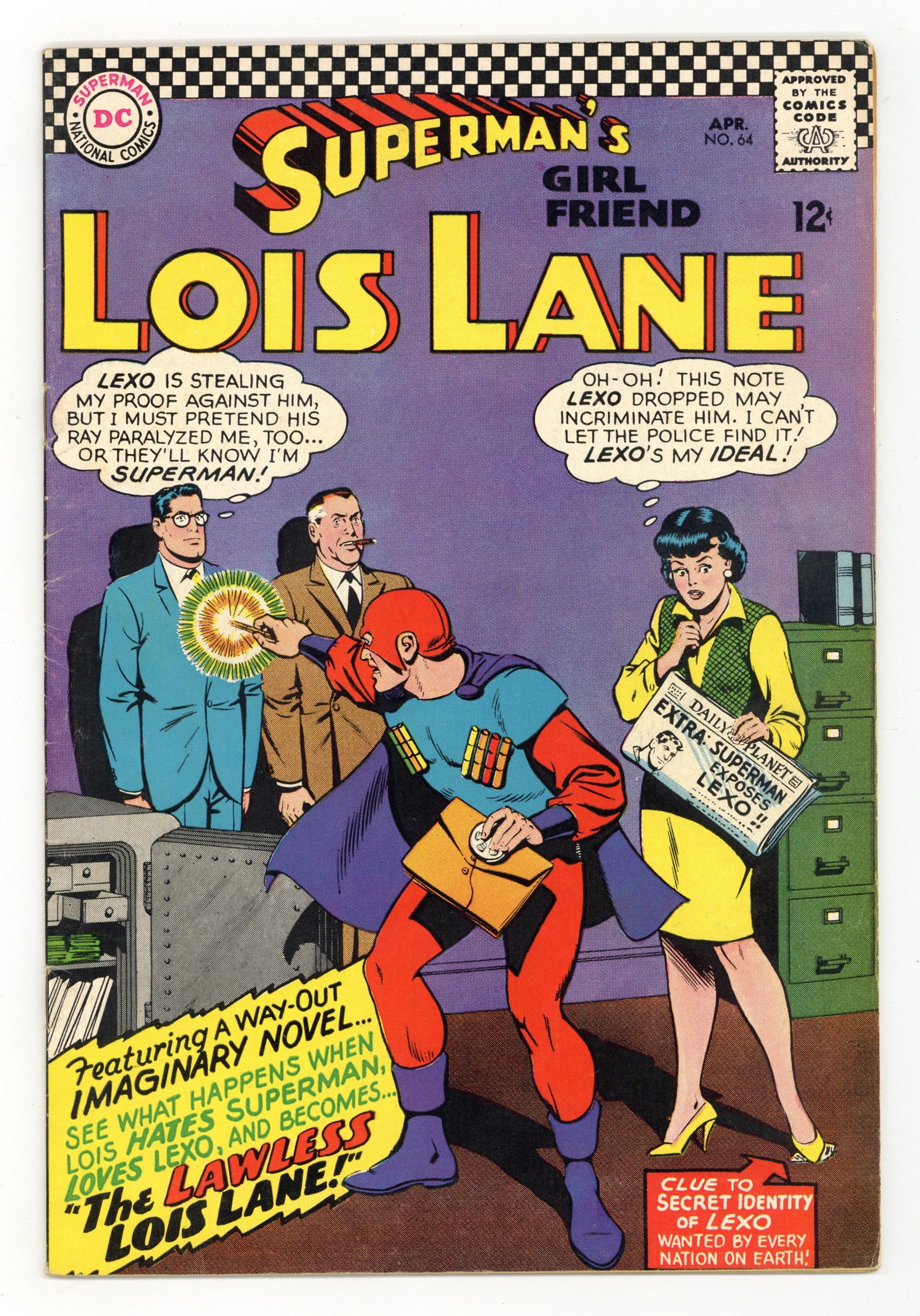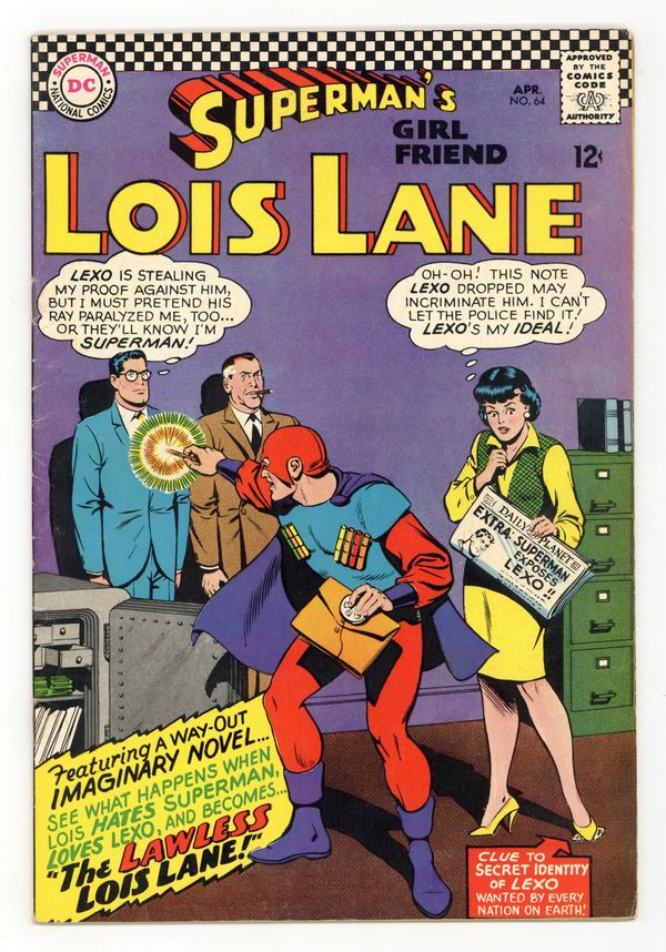 Cover art by Kurt Schaffenberger. The Lawless Lois Lane! Part I, script by Jerry Siegel, art by Kurt Schaffenberger; Lois Lane discovers that Lex Luthor is really the villain Lexo (imaginary story). Grandpa Munster AMT model ad, art by Chic Stone. House ad for The Flash #160. Tricksy humor page by Henry Boltinoff. The Courtship of Lois and Lexo! Part II; Lois Lane marries Lex Luthor and quits the Daily Planet, joining Lexo's gang as Lola (imaginary story, continued next issue). The Prisoner of S.K.U.L.!, script by Jerry Siegel, art by Kurt Schaffenberger; Lois helps Superman and undercover agent Van Benson to discover the true leader of S.K.U.L. The Adventures of Andy and George in the GI Joe Club ad. 36 Pages, Full Color. Cover price $0.12.