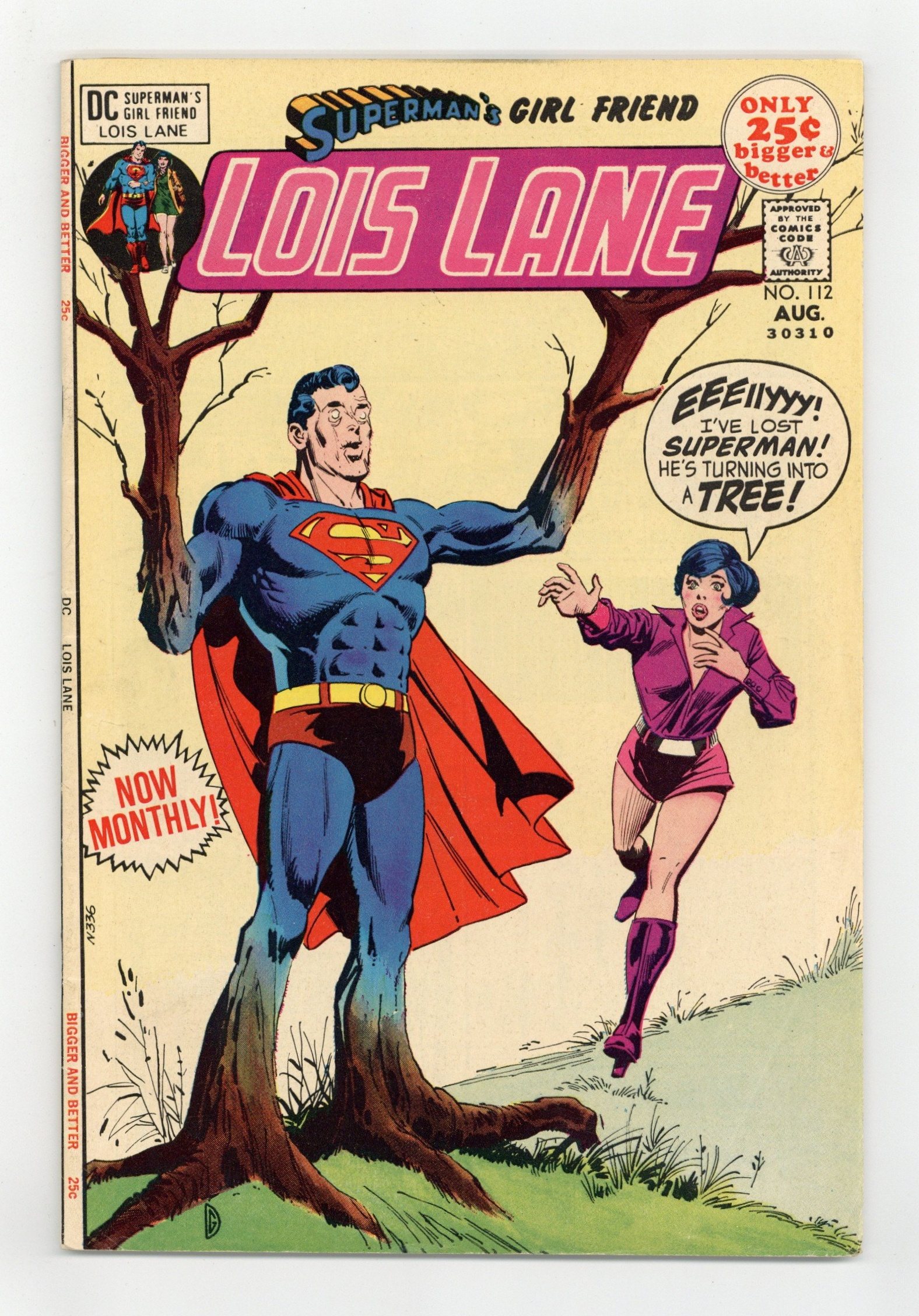Cover art by Dick Giordano. A Tree Grows in Metropolis!, script by Cary Bates, pencils by Werner Roth, inks by Vince Colletta and Murphy Anderson (Superman heads); Superman saves an alien tree, the last remaining life-form on its planet, by bringing it to Earth and planting it in Metropolis Park. Explanation for the price increase and page increase for all DC comics beginning this month by Carmine Infantino. Superman's Secret Family!, script by Jerry Siegel, art by Kurt Schaffenberger; Using a super-telescope, Lois sees Superman fly to a distant planet where he appears to be hiding a mermaid wife and son. House ad for Superman's Pal, Jimmy Olsen #140. The Robot Paradise! (Part II); Lois and Superman learn the truth about the super-family -- defective Superman robot X-3 built a robot mermaid wife and son on the faraway planet because he wanted a life like Superman's. Rock and Rose, script by Robert Kanigher, art by Dick Giordano; The Thorn saves her would-be assassin when the 100 turns on him, then helps him start on the right path. 52 Pages, Full Color. Cover price $0.25.