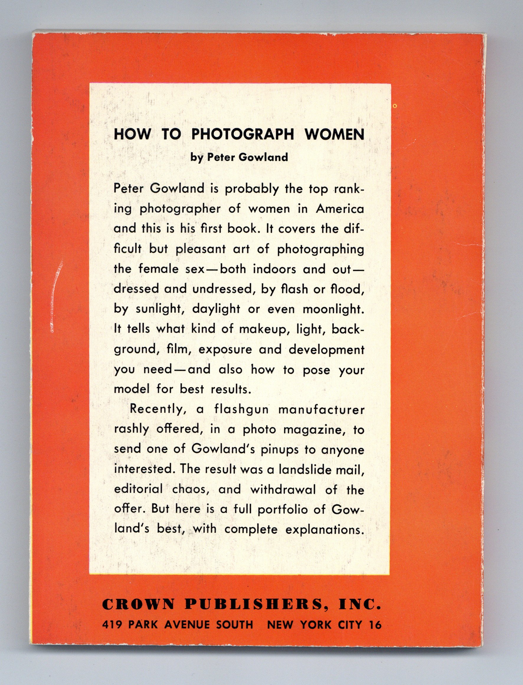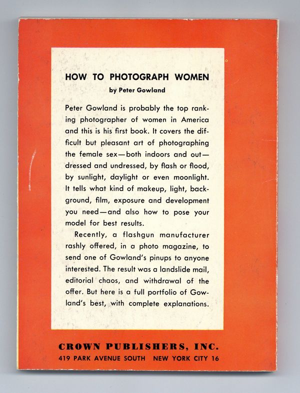 Published 1953 by Crown Publishing.$35.00Later printing. Written by Peter Gowland, a well known glamour photographer. Well illustrated with examples. 5-in. x 6 3/4-in., 144 pages, B&W. Cover price $1.00.