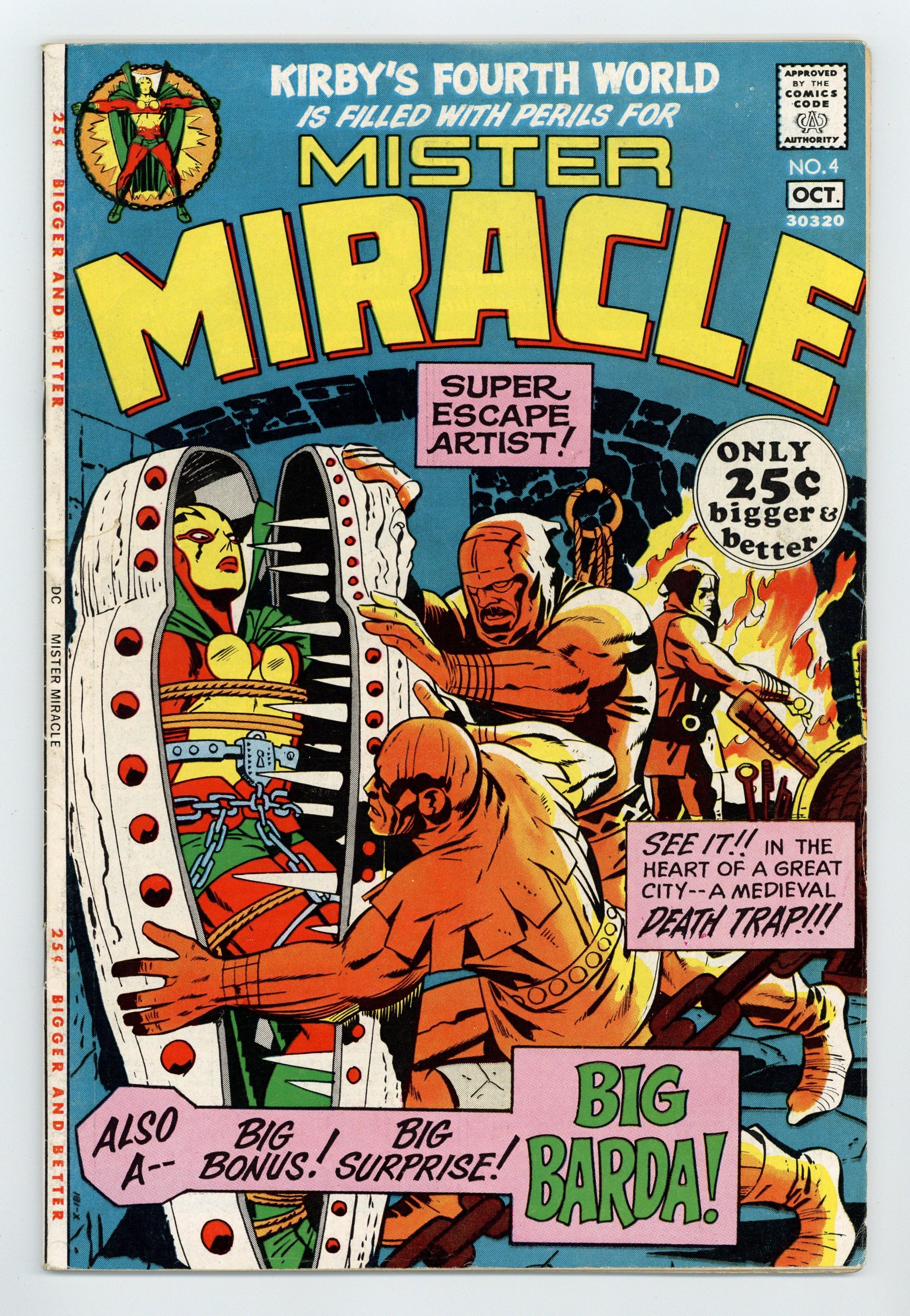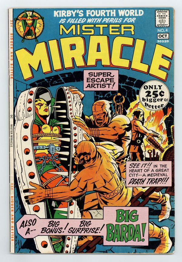 "The Closing Jaws of Death." Yet another action packed, whiz bang adventure, this issue finds Mister Miracle trying to escape from a trap by Dr. Bedlam. Features the first appearance of Big Barda. Back-up Boy Commandos reprints begin in this issue. Script, pencils, and cover by Jack Kirby. Inks by Vince Colletta. Cover price $0.25.