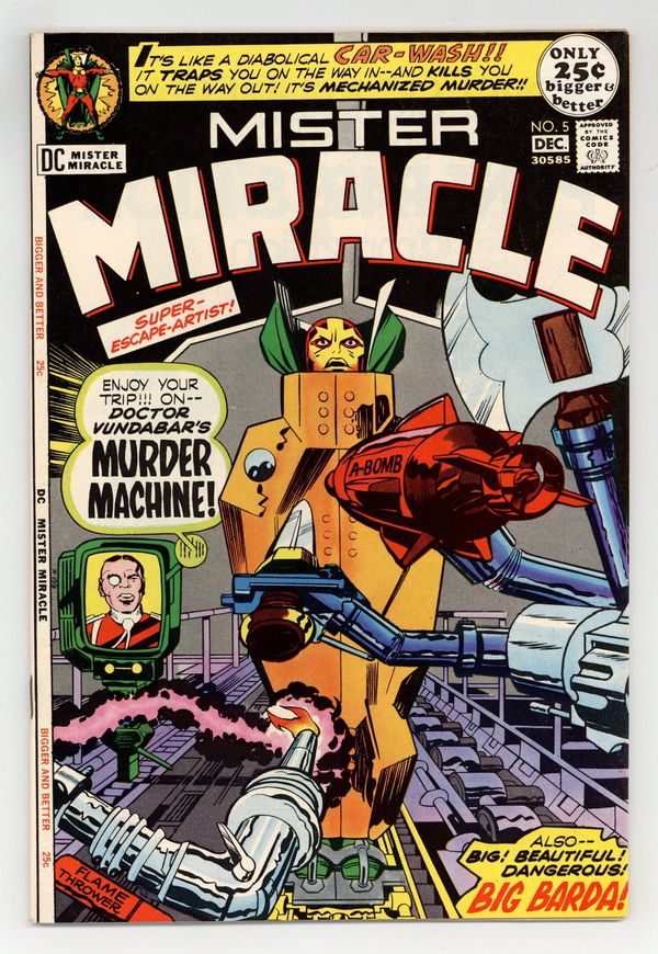 $12.25"Murder Machine." Virman Vundabar captures Big Barda, who proves to be the perfect bait for Mister Miracle. Script, pencils, and cover by Jack Kirby. Inks by Mike Royer. Cover price $0.25.
