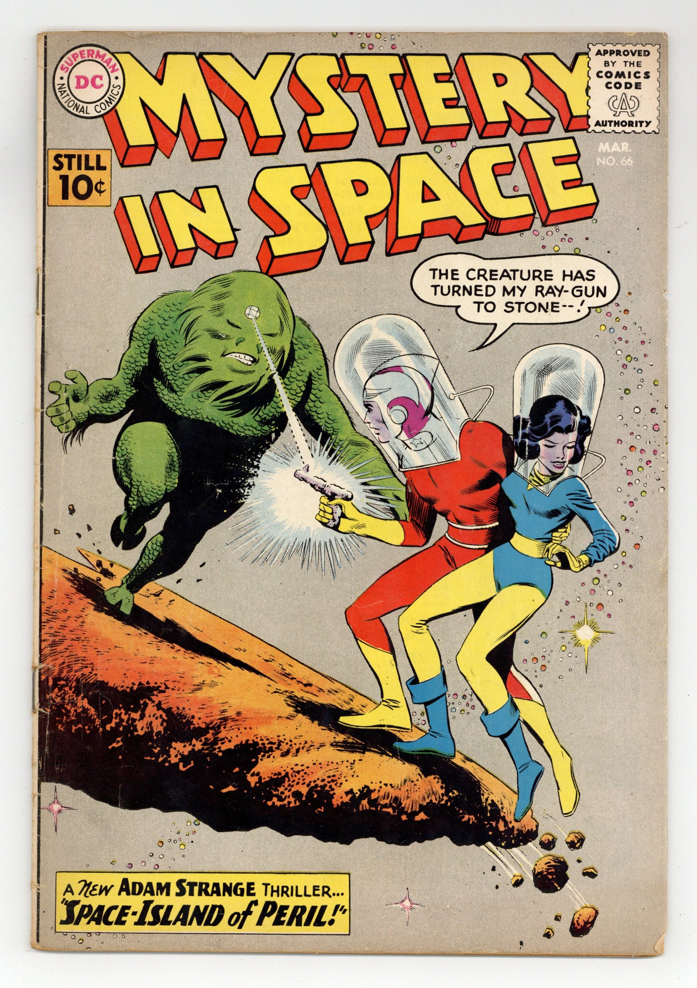 Adam Strange stars in "Space-Island of Peril!" (pencils by Carmine Infantino). Back-up stories: "Beauty and the Robot!" and "Who Caught the Loborilla?" (art by Sid Greene?). Infantino cover pencils. 36 Pages, Full Color. Cover price $0.10.