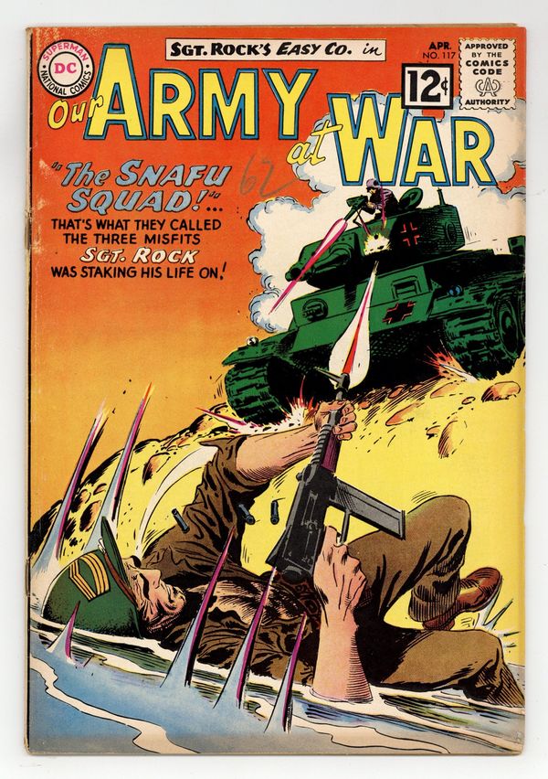 $44.00Cover art by Joe Kubert. Snafu Squad starring Sgt Rock, script by Bob Kanigher, pencils by Joe Kubert, inks by Joe Kubert. Infantry Insignia fact page. The Sarge Was a Mule starring Sgt. Mule, script by Hank Chapman, art by Jack Abel. Do You Know Your Neighbors? public service announcement starring Buzzy, script by Jack Schiff, art by Win Mortimer. No-Ace Squadron, script by Hank Chapman, art by Jerry Grandenetti. 36 Pages, Full Color. Cover price $0.12.