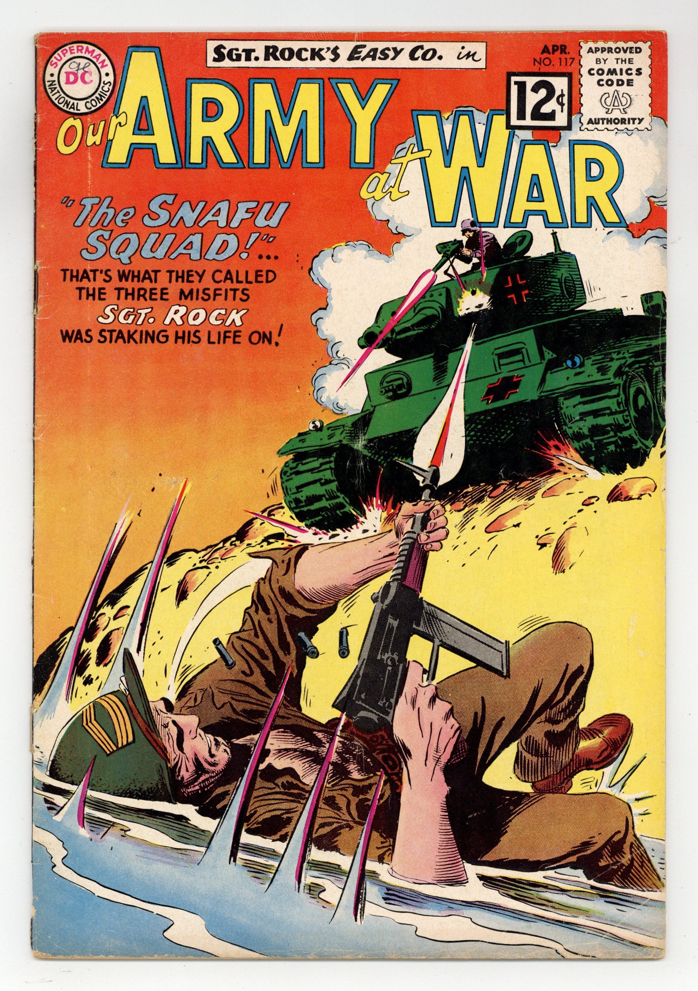 Cover art by Joe Kubert. Snafu Squad starring Sgt Rock, script by Bob Kanigher, pencils by Joe Kubert, inks by Joe Kubert. Infantry Insignia fact page. The Sarge Was a Mule starring Sgt. Mule, script by Hank Chapman, art by Jack Abel. Do You Know Your Neighbors? public service announcement starring Buzzy, script by Jack Schiff, art by Win Mortimer. No-Ace Squadron, script by Hank Chapman, art by Jerry Grandenetti. 36 Pages, Full Color. Cover price $0.12.