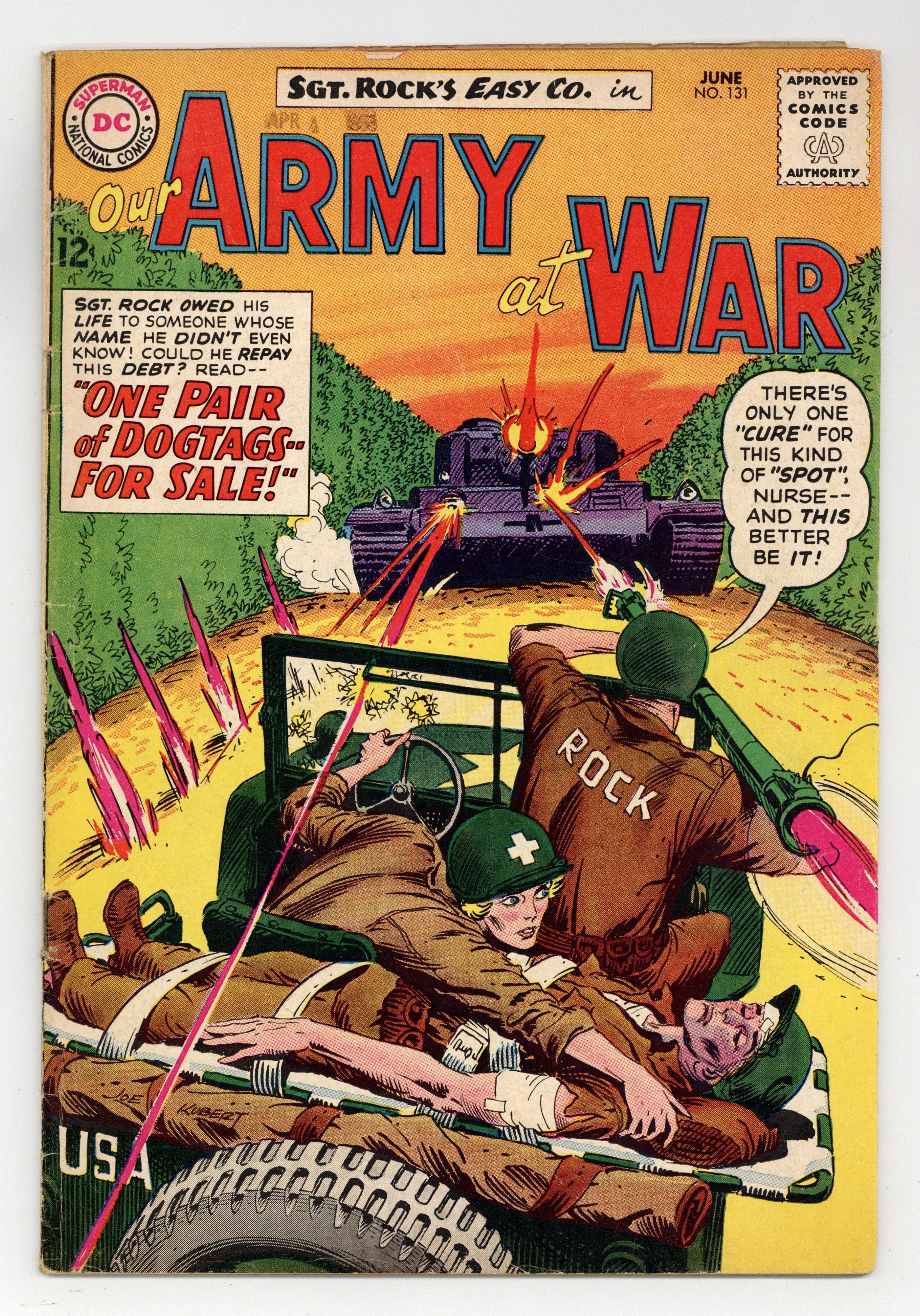 Cover art by Joe Kubert. One Pair of Dogtags -- For Sale starring Sgt. Rock, script by Bob Kanigher, art by Joe Kubert. Desert Hotfoot, script by Bob Haney, art by Jack Abel. Everybody Makes It In Dog Co., script by Bob Kanigher, art by Jack Abel. 36 Pages, Full Color. Cover price $0.12.