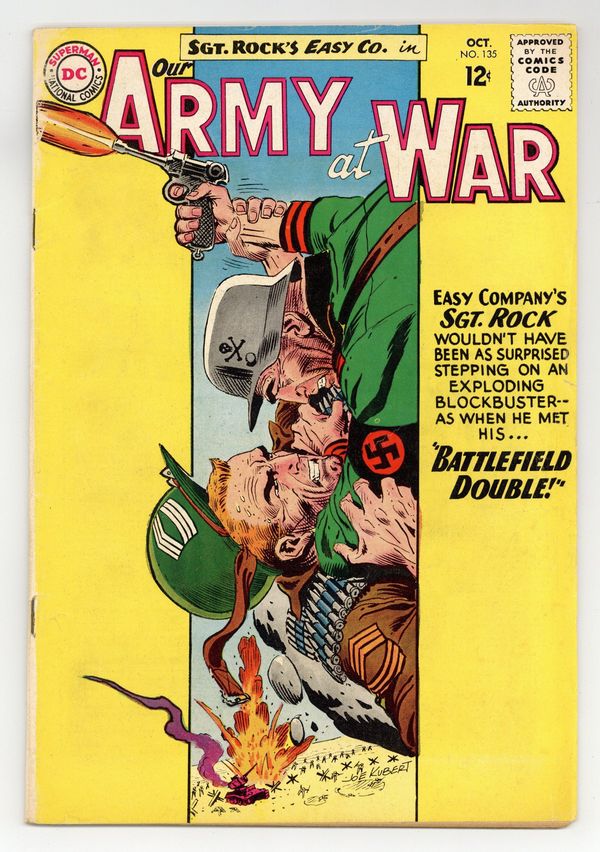 $22.50Cover art by Joe Kubert. Battlefield Double starring Sgt Rock, script by Bob Kanigher, art by Joe Kubert. Invasion Jitters, script by Hank Chapman, art by Jerry Grandenetti. Play It Safe! public service announcement, script by Jack Schiff, art by Sheldon Moldoff. 36 Pages, Full Color. Cover price $0.12.