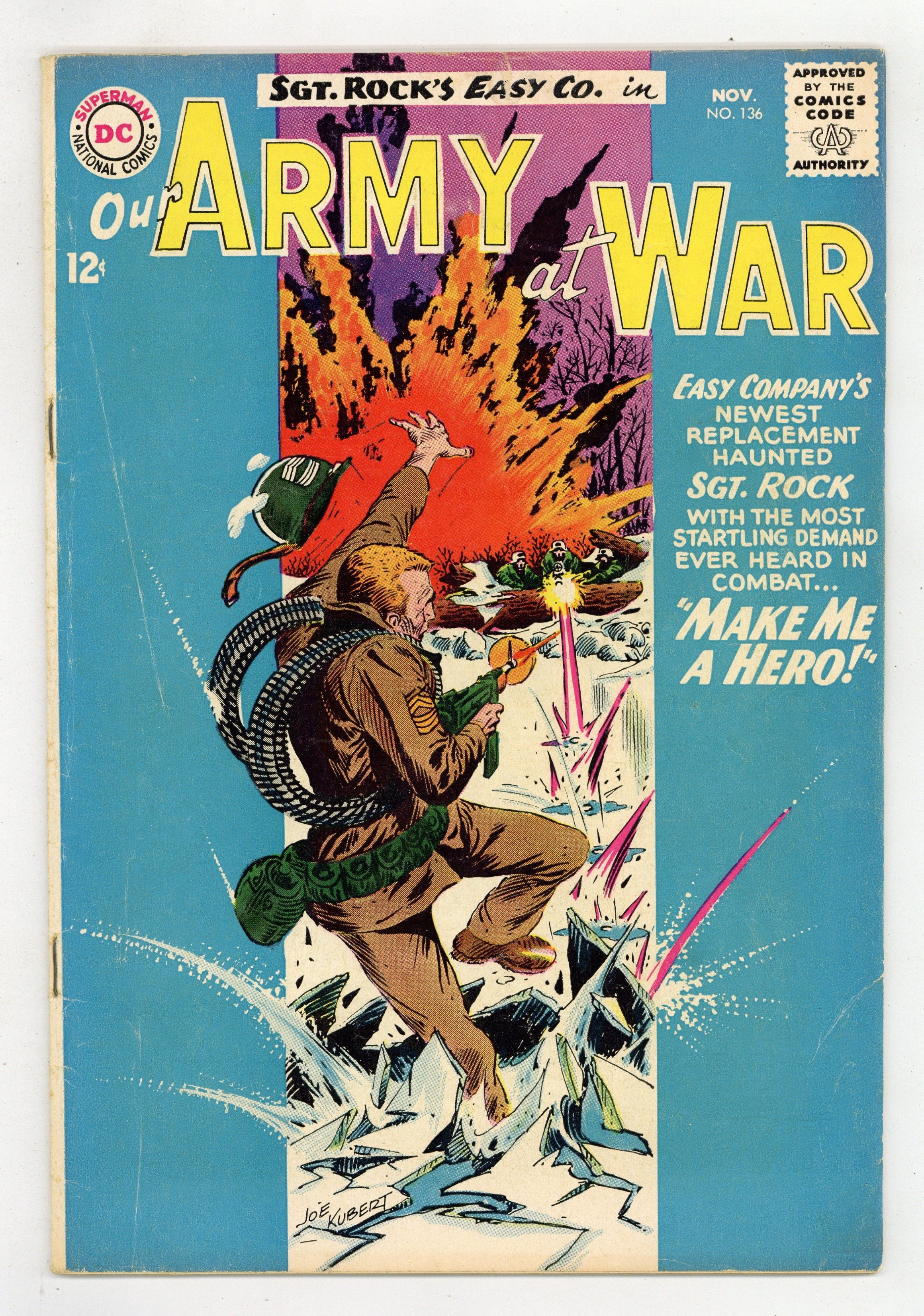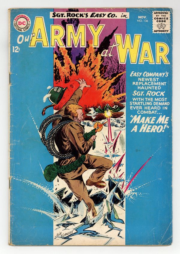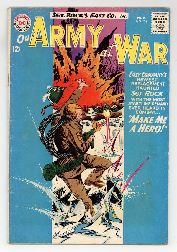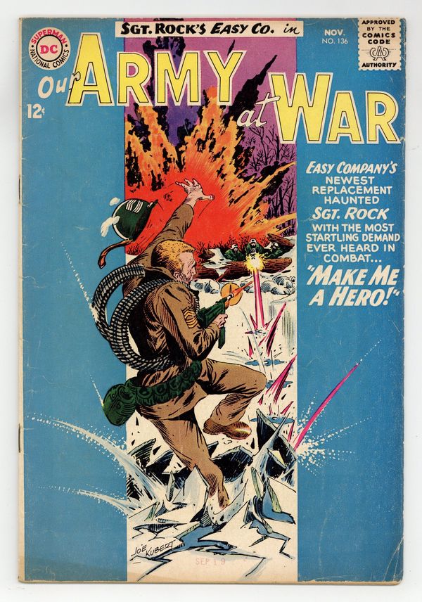 Cover art by Joe Kubert. Make Me a Hero starring Sgt., script by Bob Kanigher, art by Joe Kubert. New member makes unusual demand on Rock. I, the Bazooka, script by Hank Chapman, art by Jack Abel. 36 Pages, Full Color. Cover price $0.12.