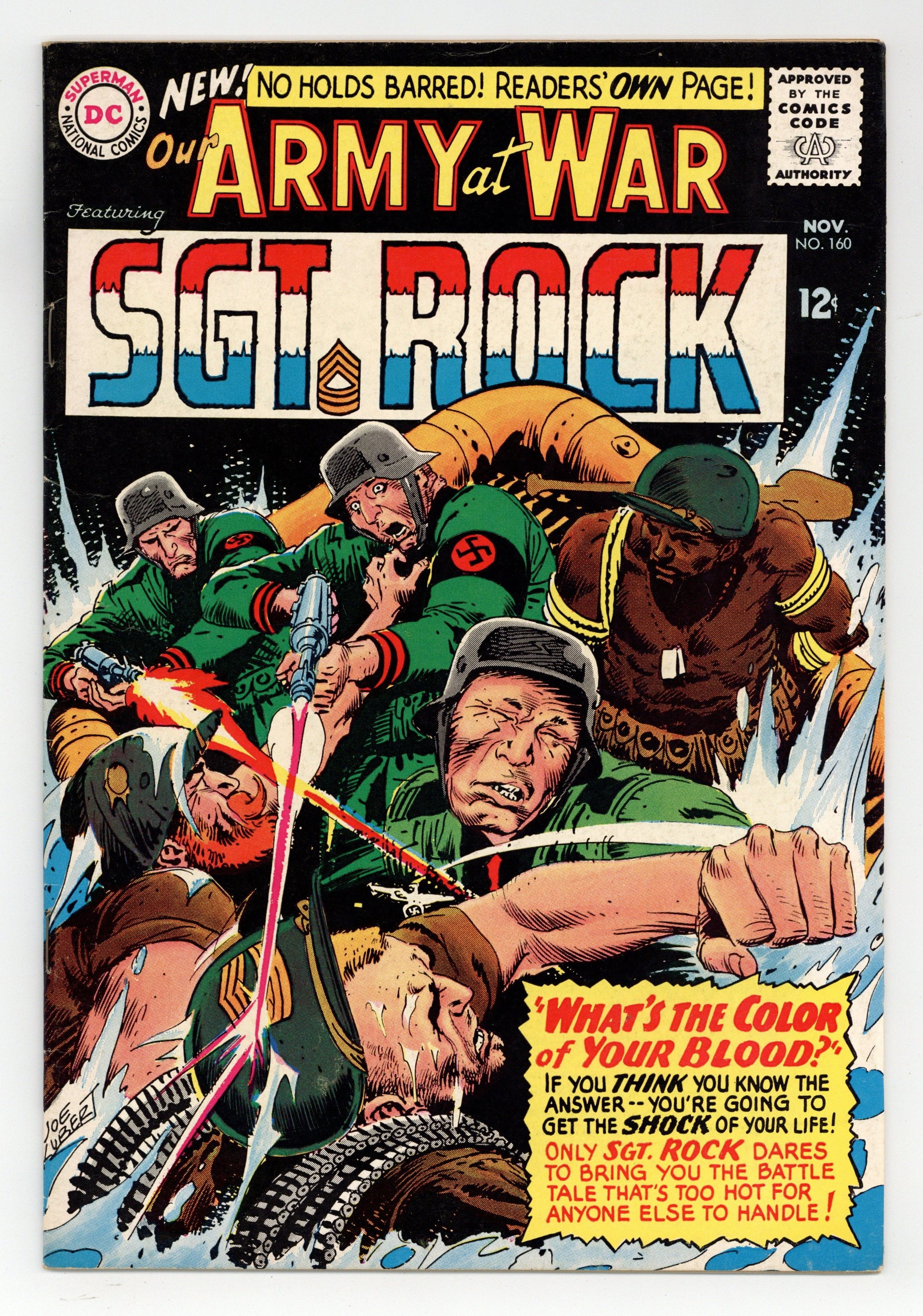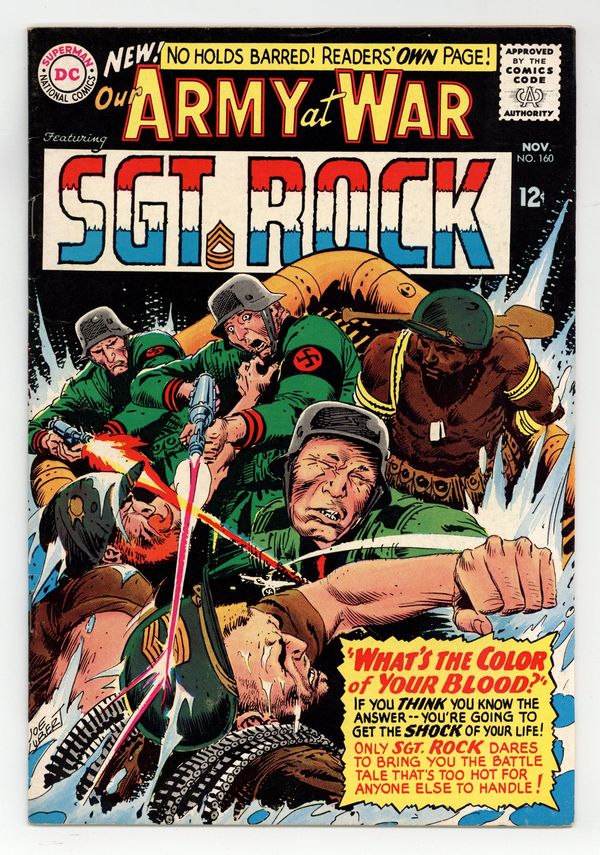 $24.50Cover art by Joe Kubert. What's the Color of Your Blood? starring Sgt. Rock, script by Bob Kanigher, art by Joe Kubert. The Hip Way to Learn! public service announcement, script by Jack Schiff, art by Sheldon Moldoff. Jackass Volunteer! starring Sgt. Mule, script by Hank Chapman, art by Jack Abel. 36 Pages, Full Color. Cover price $0.12.
