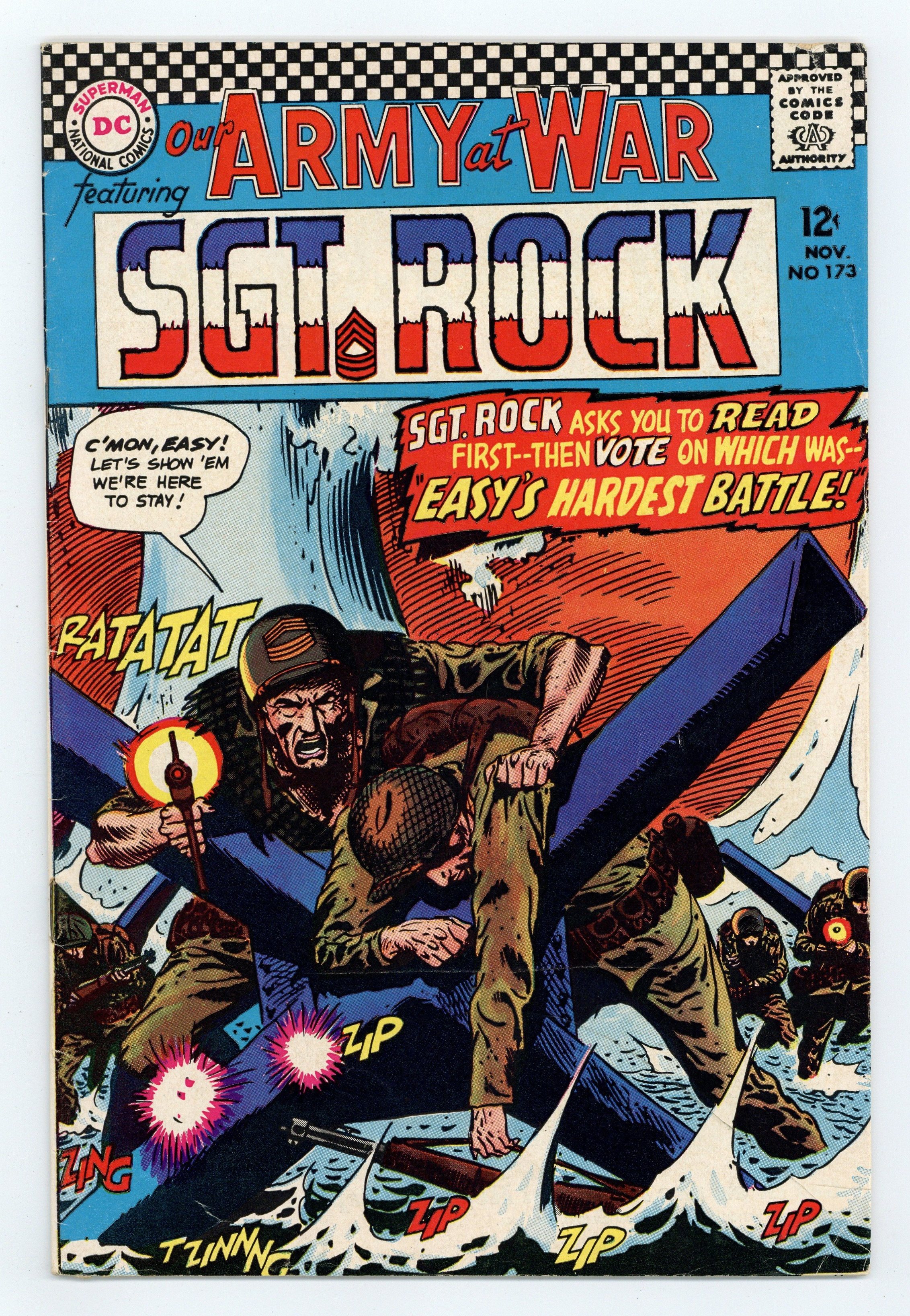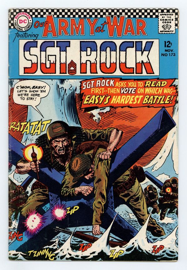 Cover art by Joe Kubert. Easy's Hardest Battle starring Sgt. Rock, script by Bob Kanigher, art by Joe Kubert. Rock asks readers to vote on Easy's hardest battle. Fight to the Finish, script by Howard Liss, art by Gene Colan. 36 Pages, Full Color. Cover price $0.12.