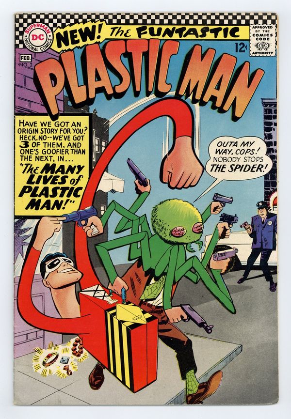 "The Three Faces of Plastic Man." Dr. Dome triplicates Lynx and has her interview three of Plastic Man's pals in order to deduce his true origin and ultimately defeat him. Script by Arnold Drake, art by Win Mortimer. Cover by Mortimer. Cover price $0.12.