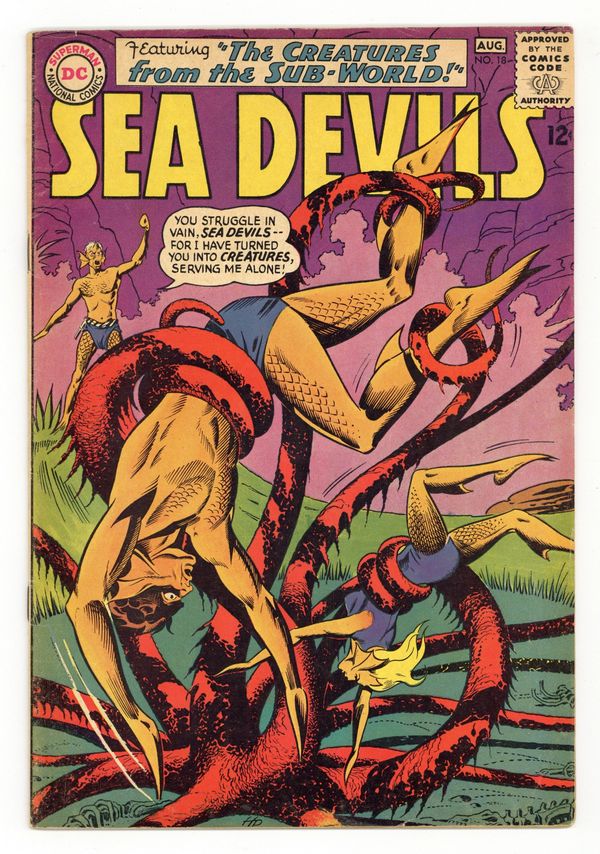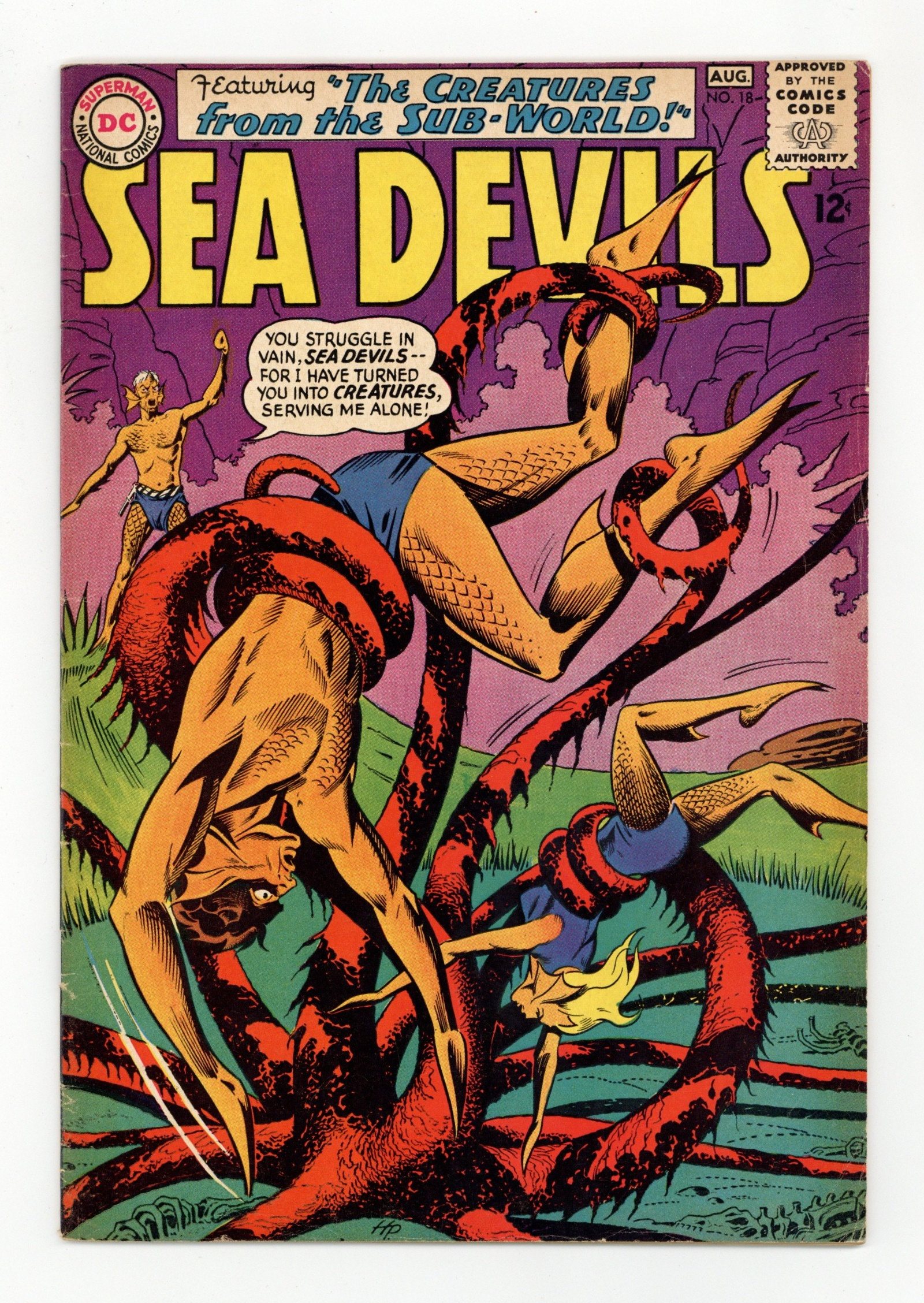 $17.50Written by unknown. Art by Howard Purcell and Sheldon Moldoff. Cover by Howard Purcell. The Sea Devils in a book-length thriller told in three parts: "The Creatures from the Sub-World"; "Part 2: The Sea Devil Creatures"; and "Part 3: The Doom of the Crusher Plant"! Plus: untitled Marine Almanac! 1-pager, reprinted from GI Combat (1952) #69; 1-page public service announcement "Learn from Your Hobbies!" by Jack Schiff and Sheldon Moldoff; untitled The Magic Genie half-pager by Henry Boltinoff; and untitled Shorty 1-pager by Henry Boltinoff, reprinted from Detective Comics (1937 1st Series) #189. 32 pages, full color. Cover price $0.12.